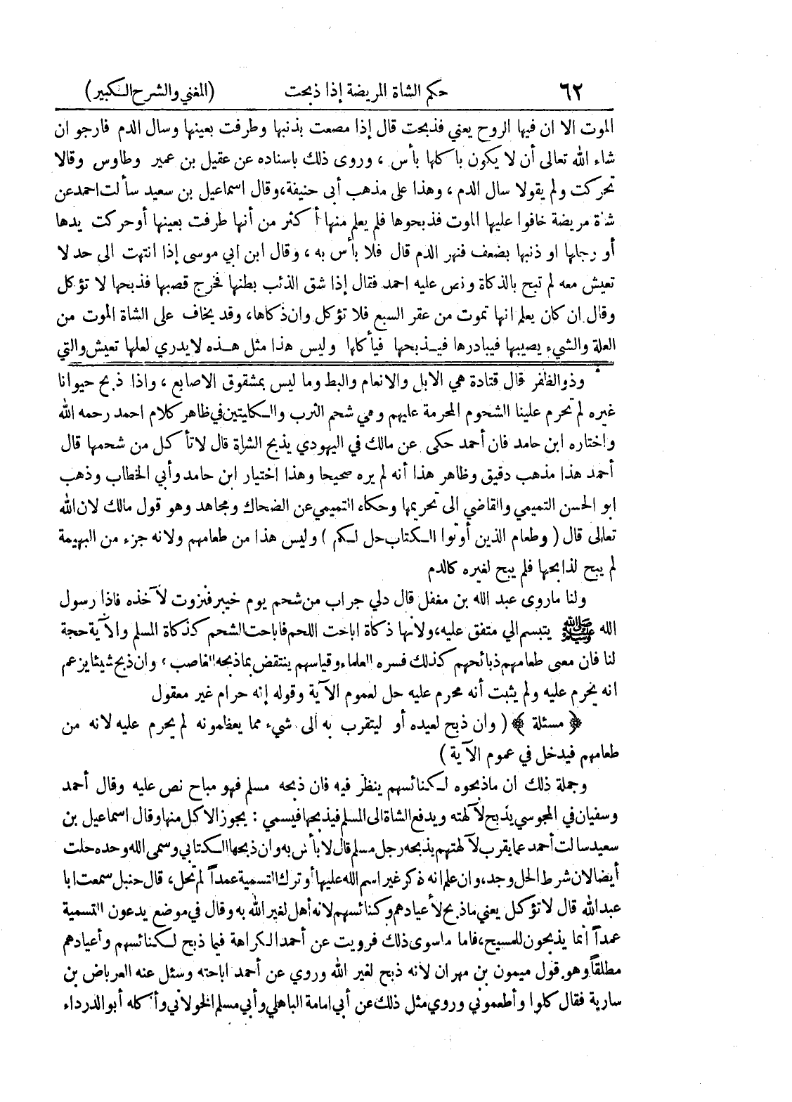 لم يبح لذابحها فلم يبح لغيره كالدم ولنا ما روى عبد الله بن مغفل قال دلي جراب من شحم يوم خيبر فنزوت لآخذه فإذا رسول الله صلى الله عليه وسلم يتبسم إلي متفق عليه، ولأنها ذكاة أباحت اللحم فأباحت الشحم كذكاة المسلم والآية حجة لنا فإن معنى طعامهم ذبائحهم كذلك فسره العلماء وقياسهم ينتقض بما ذبحه الغاصب، وإن ذبح شيئاً يزعم أنه يحرم عليه ولم يثبت أنه محرم عليه حل لعموم الآية وقوله إنه حرام غير معقول * (مسألة) * (وان ذبح لعيده أو ليتقرب به إلى شئ مما يعظمونه لم يحرم عليه لأنه من طعامهم فيدخل في عموم الآية) وجملة ذلك أن ما ذبحوه لكنائسهم ينظر فيه فإن ذبح مسلم فهو مباح نص عليه وقال أحمد وسفيان في المجوسي يذبح لآلهته ويدفع الشاة إلى المسلم فيذبحها فيسمي: يجوز الأكل منها وقال إسماعيل بن سعيد سألت أحمد عما يقرب لآلهتم يذبحه رجل مسلم قال لا بأس به وأن ذبحها الكتابي وسمى الله وحده حلت أيضاً لأن شرط الحل وجد، وإن علم أنه ذكر غير اسم الله عليها أو ترك التسمية عمداً لم تحل، قال حنبل سمعت أبا عبد الله قال لا تؤكل يعني ما ذبح لأعيادهم وكنائسهم لأنه أهل لغير الله به وقال في موضع يدعون التسمية عمداً أنما يذبحون للمسيح، فأما ما سوى ذلك فرويت عن أحمد الكراهة فيما ذبح لكنائسهم وأعيادهم مطلقاً وهو قول ميمون بن مهران لأنه ذبح لغير الله وروى عن أحمد إباحته وسئل عنه العرباض بن سارية فقال كلوا وأطعموني وروي مثل ذلك عن أبي أمامة الباهلي وأبي مسلم الخولاني وأكله أبو الدرداء