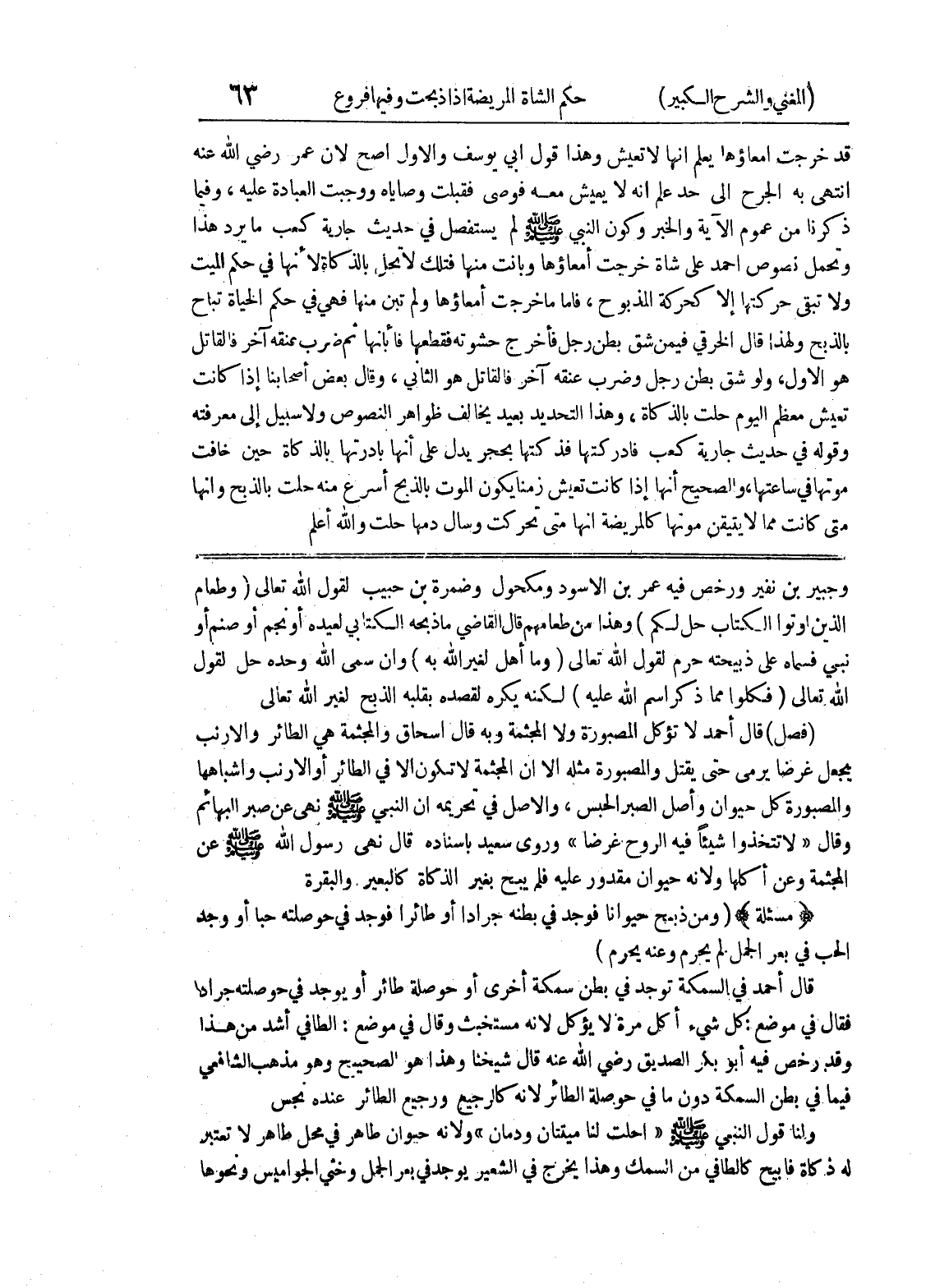 والمصبورة كل حيوان وأصل الصبر الحبس، والأصل في تحريمه أن النبي صلى الله عليه وسلم نهى عن صبر البهائم وقال " لا تتخذوا شيئاً فيه الروح غرضا " وروى سعيد بإسناده قال نهى رسول الله صلى الله عليه وسلم عن المجثمة وعن أكلها ولأنه حيوان مقدور عليه فلم يبح بغير الذكاة كالبعير والبقرة * (مسألة) * (ومن ذبح حيواناً فوجد في بطنه جراداً أو طائرا فوجد في حوصلته حبا أو وجد الحب في بعر الجمل لم يحرم وعنه يحرم) قال أحمد في السمكة توجد في بطن سمكة أخرى أو حوصلة طائر أو يوجد في حوصلته جراد فقال في موضع: كل شئ أكل مرة لا يؤكل لأنه مستخبث وقال في موضع: الطافي أشد من هذا وقد رخص فيه أبو بكر الصديق رضي الله عنه قال شيخنا وهذا هو الصحيح وهو مذهب الشافعي فيما في بطن السمكة دون ما في حوصلة الطائر لأنه كالرجيع ورجيع الطائر عنده نجس ولنا قول النبي صلى الله عليه وسلم " أحلت لنا ميتتان ودمان " ولأنه حيوان طاهر في محل طاهر لا تعتبر له ذكاة فأبيح كالطافي من السمك وهذا يخرج في الشعير يوجد في بعر الجمل وخثي الجواميس ونحوها