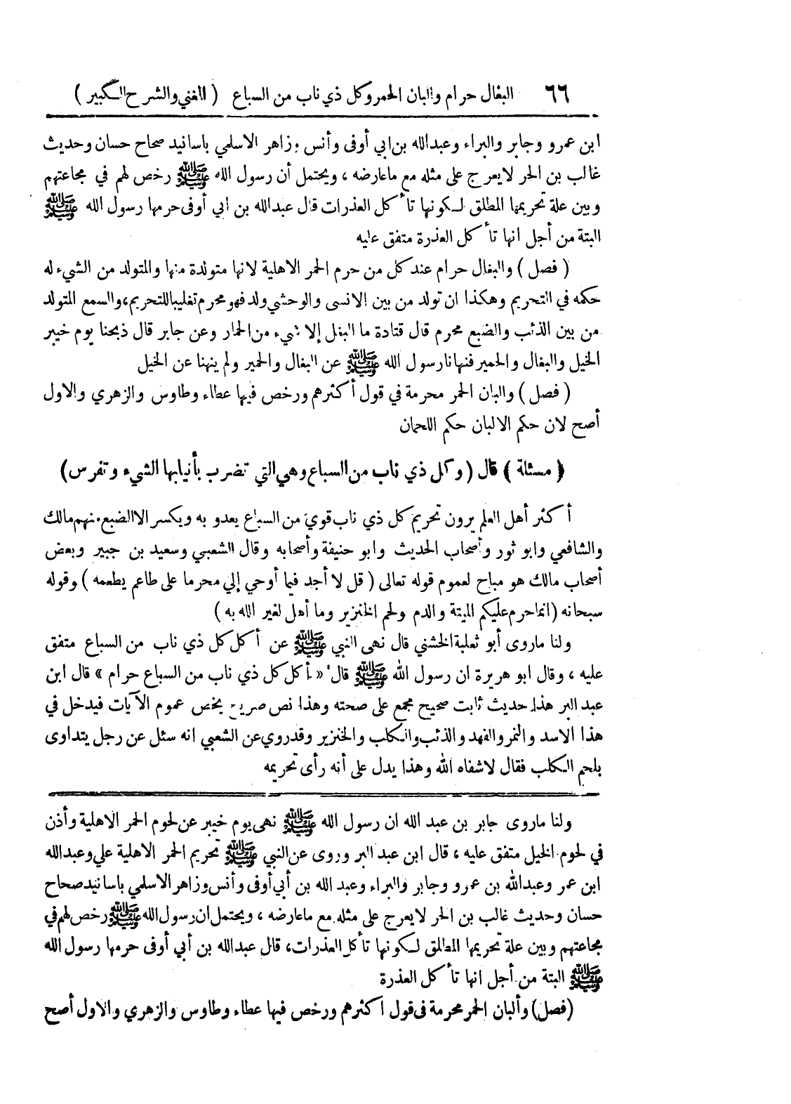 ولنا ما روى جابر بن عبد الله أن رسول الله صلى الله عليه وسلم نهى يوم خيبر عن لحوم الحمر الأهلية وأذن في لحوم الخيل متفق عليه، قال ابن عبد البر وروي عن النبي صلى الله عليه وسلم تحريم الحمر الأهلية علي وعبد الله ابن عمر وعبد الله بن عمر وجابر والبراء وعبد الله بن أبي أوفى وأنس وزاهر الأسلمي بأسانيد صحاح حسان وحديث غالب بن الحر لا يعرج على مثله مع ما عارضه، ويحتمل أن رسول الله صلى الله عليه وسلم رخص لهم في مجاعتهم وبين علة تحريمها المطلق لكونها تأكل العذرات، قال عبد الله بن أبي أوفى حرمها رسول الله صلى الله عليه وسلم البتة من أجل أنها تأكل العذرة (فصل) وألبان الحمر محرمة في قول أكثرهم ورخص فيها عطاء وطاوس والزهري والأول أصح