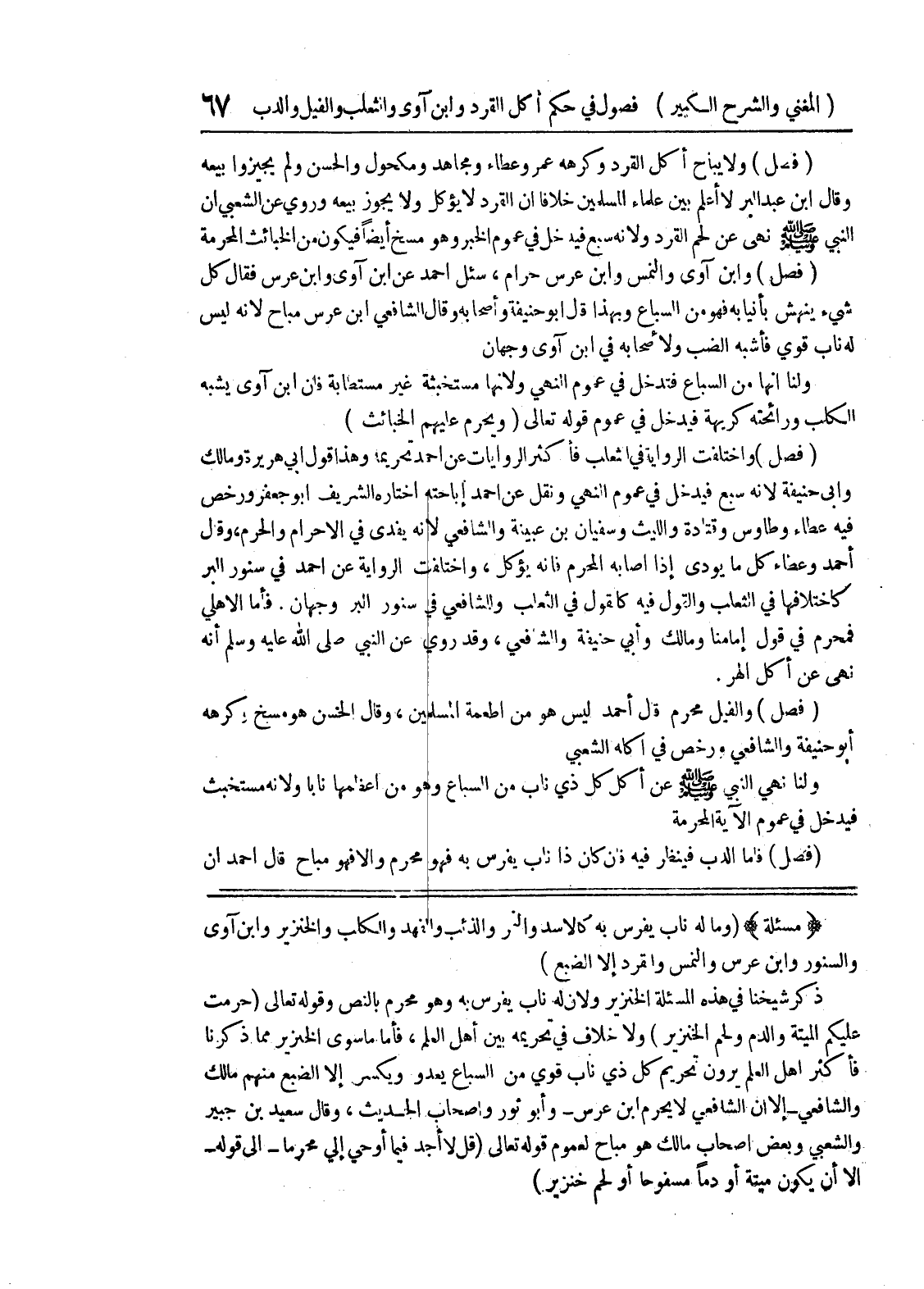 * (مسألة) * (وما له ناب يفرس به كالاسد والتمر والذئب والفهد والكلب والخنزير وابن آوى والسنور وابن عرس والنمس والقرد إلا الضبع) ذكر شيخنا في هذه المسألة الخنزير ولأن له ناب يفرس به وهو محرم بالنص وقوله تعالى (حرمت عليكم الميتة والدم ولحم الخنزير) ولا خلاف في تحريمه بين أهل العلم، فأما ما سوى الخنزير مما ذكرنا فأكثر أهل العلم يرون تحريم كل ذي ناب قوي من السباع يعدو ويكسر إلا الضبع منهم مالك والشافعي - إلا أن الشافعي لا يحرم ابن عرس - وأبو ثور وأصحاب الحديث، وقال سعيد بن جبير
