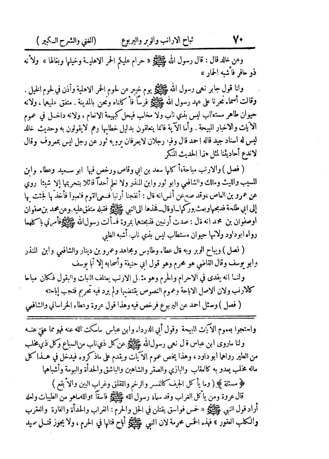 ولنا ما روى ابن عباس قال نهى رسول الله صلى الله عليه وسلم عن كل ذي ناب من السباع وكل ذي مخلب من الطير رواهما أبو داود، وهذا يخص عموم الآيات ويقدم على ما ذكروه فيدخل في هذا كل ماله مخلب يعدو به كالعقاب والبازي والصقر والشاهين والباشق والحدأة والبومة وأشباهها * (مسألة) * (وما يأكل الجيف كالنسر والرخم واللقلق وغراب البين والأبقع) قال عروة ومن يأكل الغراب وقد سماه رسول الله صلى الله عليه وسلم فاسقاً؟ والله ما هو من الطيبات ولعله أراد قول النبي صلى الله عليه وسلم " خمس فواسق يقتلن في الحل والحرم: الغراب والحدأة والفأرة والعقرب والكلب العقور " فهذه الخمس محرمة لأن النبي صلى الله عليه وسلم أباح قتلها في الحرم، ولا يجوز قتل صيد
