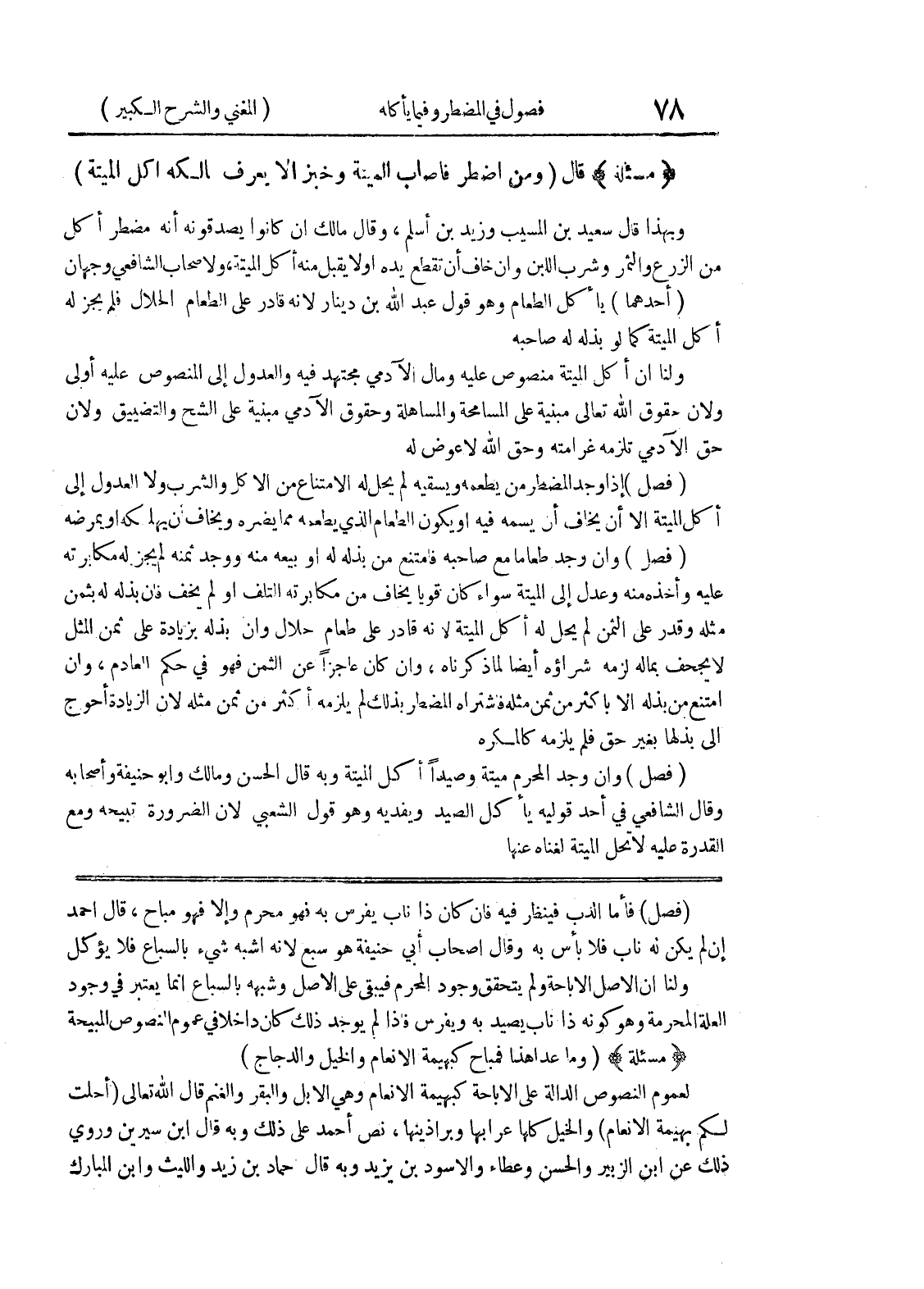 (فصل) فأما الدب فينظر فيه فإن كان ذا ناب يفرس به فهو محرم وإلا فهو مباح، قال أحمد إن لم يكن له ناب فلا بأس به وقال أصحاب أبي حنيفة هو سبع لأنه اشبه شئ بالسباع فلا يؤكل ولنا أن الأصل الإباحة ولم يتحقق وجود المحرم فيبقى على الأصل وشبهه بالسباع إنما يعتبر في وجود العلة المحرمة وهو كونه ذا ناب يصيد به ويفرس فإذا لم يوجد ذلك كان داخلا في عموم النصوص المبيحة * (مسألة) * (وما عدا هذا فمباح كبهيمة الأنعام والخيل والدجاج) لعموم النصوص الدالة على الإباحة كبهيمة الأنعام وهي الإبل والبقر والغنم قال الله تعالى (أحلت لكم بهيمة الأنعام) والخيل كلها عرابها وبراذينها، نص أحمد على ذلك وبه قال ابن سيرين وروي ذلك عن ابن الزبير والحسن وعطاء والأسود بن يزيد وبه قال حماد بن زيد والليث وابن المبارك