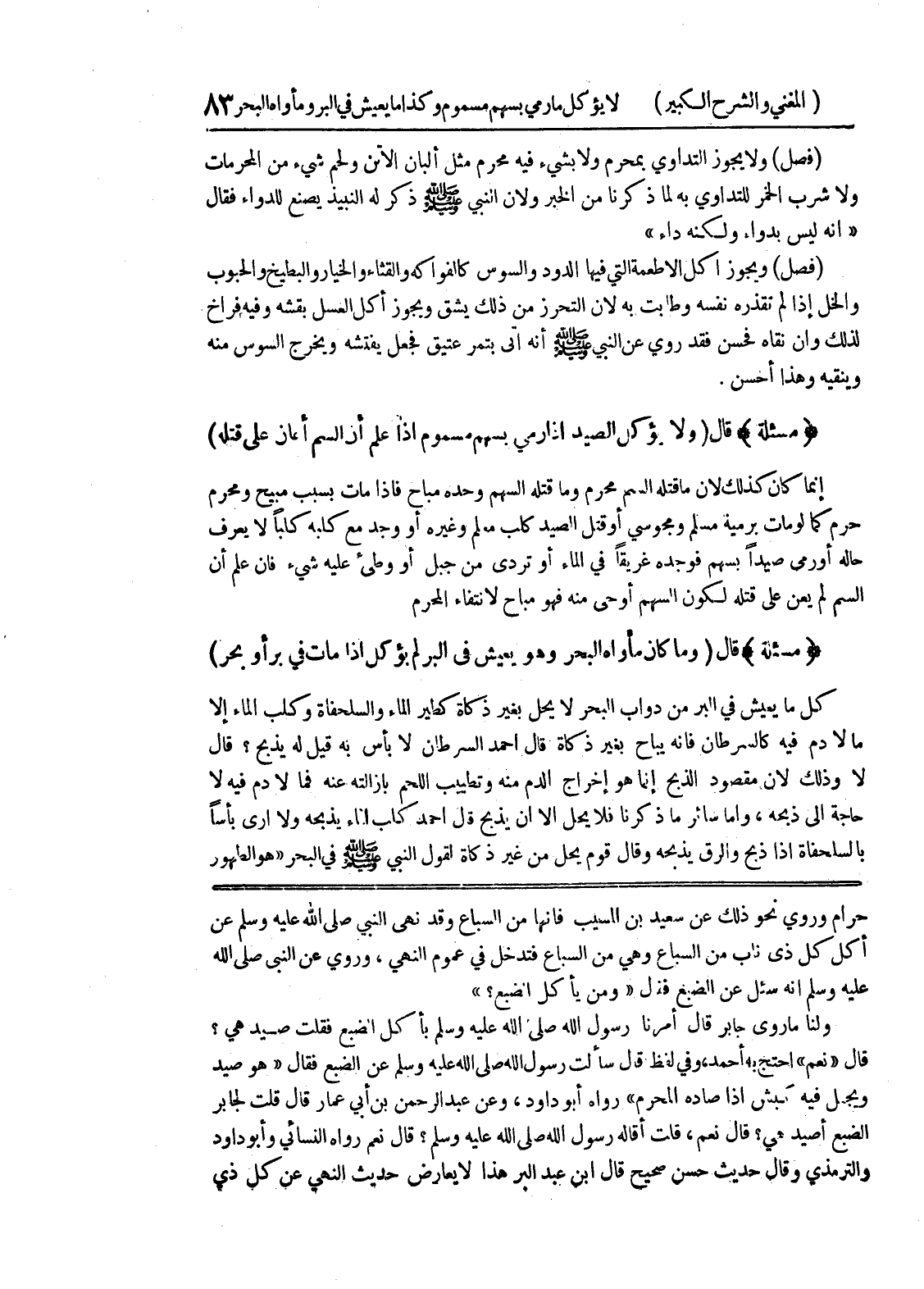 حرام وروي نحو ذلك عن سعيد بن المسيب فإنها من السباع وقد نهى النبي صلى الله عليه وسلم عن أكل كل ذي ناب من السباع وهي من السباع فتدخل في عموم النهي، وروي عن النبي صلى الله عليه وسلم أنه سئل عن الضبع فقال " ومن يأكل الضبع؟ " ولنا ما روى جابر قال أمرنا رسول الله صلى الله عليه وسلم بأكل الضبع فقلت صيد هي؟ قال " نعم " احتج به أحمد، وفي لفظ قال سألت رسول الله صلى الله عليه وسلم عن الضبع فقال " هو صيد ويجعل فيه كبش إذا صاده المحرم " رواه أبو داود، وعن عبد الرحمن بن أبي عمار قال قلت لجابر الضبع أصيد هي؟ قال نعم، قلت أقاله رسول الله صلى الله عليه وسلم؟ قال نعم رواه النسائي وأبو داود والترمذي وقال حديث حسن صحيح قال ابن عبد البر هذا لا يعارض حديث النهي عن كل ذي