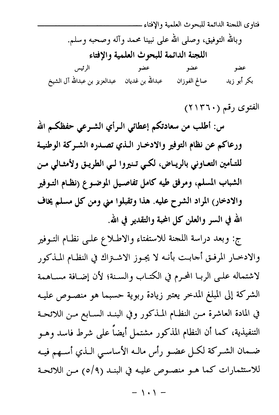 ج: وبعد دراسة اللجنة للاستفتاء والاطلاع على نظام التوفير والادخار المرفق أجابت بأنه لا يجوز الاشتراك في النظام المذكور لاشتماله على الربا المحرم في الكتاب والسنة؛ لأن إضافة مساهمة الشركة إلى المبلغ المدخر يعتبر زيادة ربوية حسبما هو منصوص عليه في المادة العاشرة من النظام المذكور وفي البند السابع من اللائحة التنفيذية، كما أن النظام المذكور مشتمل أيضا على شرط فاسد وهو ضمان الشركة لكل عضو رأس ماله الأساسي الذي أسهم فيه للاستثمارات كما هو منصوص عليه في البند (9\5) من اللائحة
