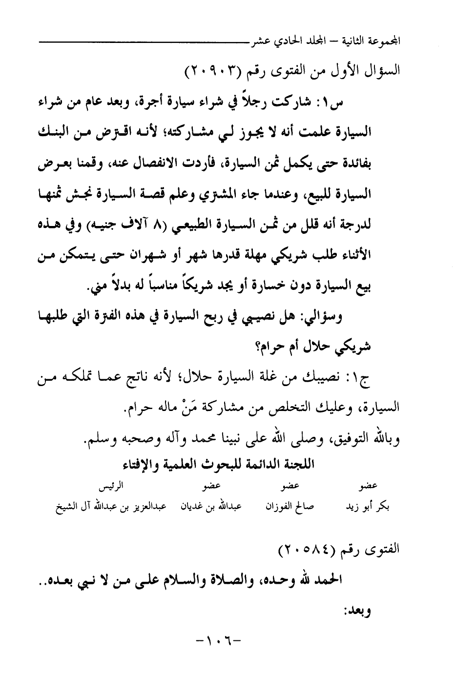 س1 شاركت رجلا في شراء سيارة أجرة، وبعد عام من شراء السيارة علمت أنه لا يجوز لي مشاركته؛ لأنه اقترض من البنك بفائدة حتى يكمل ثمن السيارة، فأردت الانفصال عنه، وقمنا بعرض السيارة للبيع، وعندما جاء المشتري وعلم قصة السيارة نجش ثمنها لدرجة أنه قلل من ثمن السيارة الطبيعي (8آلاف جنيه) وفي هذه الأثناء طلب شريكي مهلة قدرها شهر أو شهران حتى يتمكن من بيع السيارة دون خسارة أو يجد شريكا مناسبا له بدلا مني.
