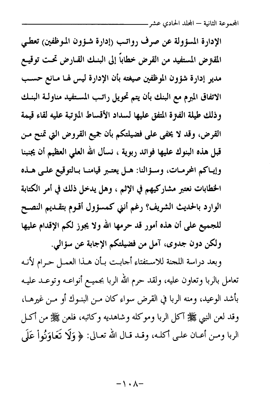 وبعد دراسة اللجنة للاستفتاء أجابت بأن هذا العمل حرام لأنه تعامل بالربا وتعاون عليه، ولقد حرم الله الربا بجميع أنواعه وتوعد عليه بأشد الوعيد، ومنه الربا في القرض سواء كان من البنوك أو من غيرها، وقد لعن النبي - صلى الله عليه وسلم - آكل الربا وموكله وشاهديه وكاتبه، فلعن - صلى الله عليه وسلم - من أكل الربا ومن أعان على أكله، وقد قال الله تعالى