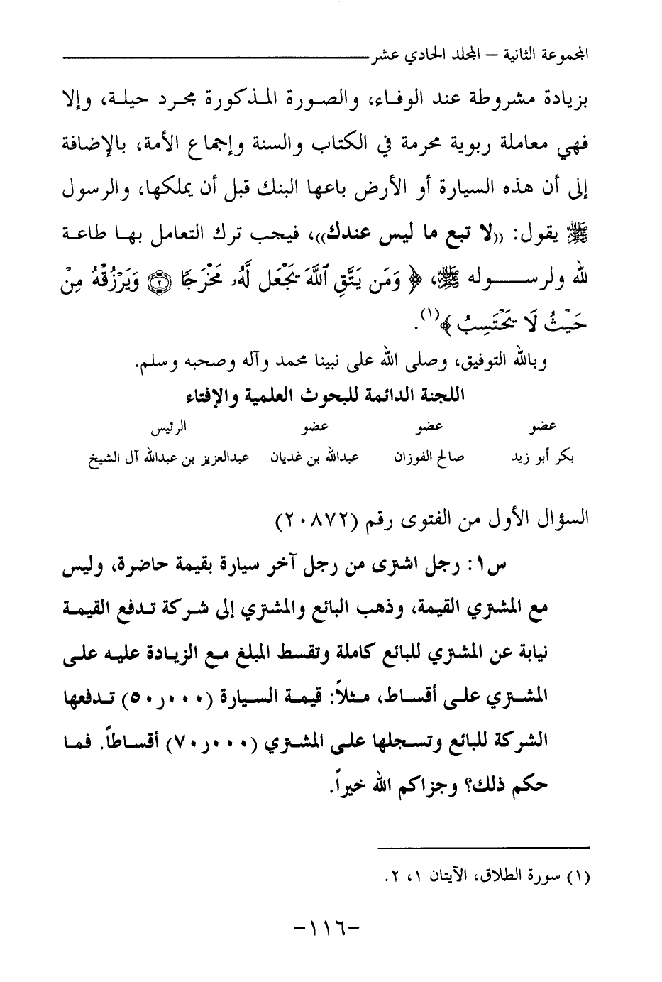 بزيادة مشروطة عند الوفاء، والصورة المذكورة مجرد حيلة، وإلا فهي معاملة ربوية محرمة في الكتاب والسنة وإجماع الأمة، بالإضافة إلى أن هذه السيارة أو الأرض باعها البنك قبل أن يملكها، والرسول - صلى الله عليه وسلم - يقول: «لا تبع ما ليس عندك (¬1) » ، فيجب ترك التعامل بها طاعة لله ولرسوله - صلى الله عليه وسلم - {وَمَنْ يَتَّقِ اللَّهَ يَجْعَلْ لَهُ مَخْرَجًا} (¬2) {وَيَرْزُقْهُ مِنْ حَيْثُ لَا يَحْتَسِبُ} (¬3) .