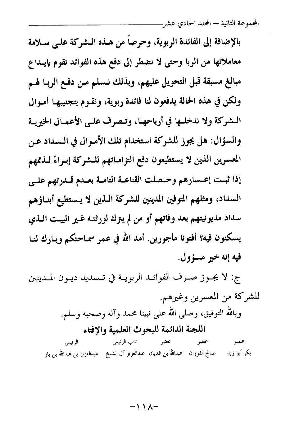 ج: لا يجوز صرف الفوائد الربوية في تسديد ديون المدينين للشركة من المعسرين وغيرهم.