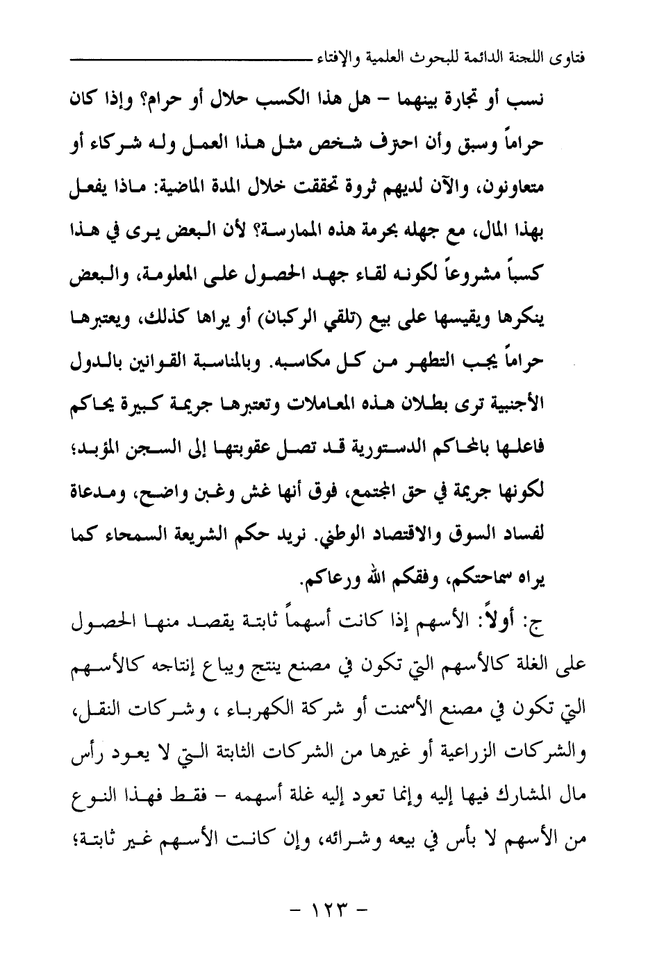 ج: أولا: الأسهم إذا كانت أسهما ثابتة يقصد منها الحصول على الغلة كالأسهم التي تكون في مصنع ينتج ويباع إنتاجه كالأسهم التي تكون في مصنع الأسمنت أو شركة الكهرباء، وشركات النقل، والشركات الزراعية أو غيرها من الشركات الثابتة التي لا يعود رأس مال المشارك فيها إليه وإنما تعود إليه غلة أسهمه ـ فقط فهذا النوع من الأسهم لا بأس في بيعه وشرائه، وإن كانت الأسهم غير ثابتة؛