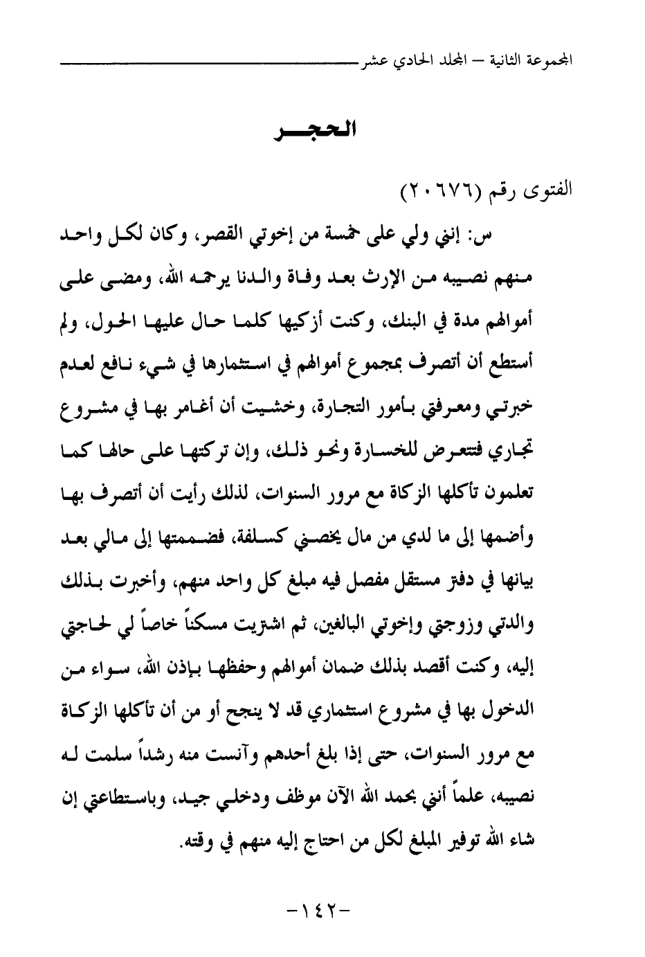 س: إنني ولي على خمسة من إخوتي القصر، وكان لكل واحد منهم نصيبه من الإرث بعد وفاة والدنا يرحمه الله، ومضى على أموالهم مدة في البنك، وكنت أزكيها كلما حال عليها الحول، ولم أستطع أن أتصرف بمجموع أموالهم في استثمارها في شيء نافع لعدم خبرتي ومعرفتي بأمور التجارة، وخشيت أن أغامر بها في مشروع تجاري فتتعرض للخسارة ونحو ذلك، وإن تركتها على حالها كما تعلمون تأكلها الزكاة مع مرور السنوات، لذلك رأيت أن أتصرف بها وأضمها إلى ما لدي من مال يخصني كسلفة، فضممتها إلى مالي بعد بيانها في دفتر مستقل مفصل فيه مبلغ كل واحد منهم، وأخبرت بذلك والدتي وزوجتي وإخوتي البالغين، ثم اشتريت مسكنا خاصا لي لحاجتي إليه، وكنت أقصد بذلك ضمان أموالهم وحفظها بإذن الله، سواء من الدخول بها في مشروع استثماري قد لا ينجح أو من أن تأكلها الزكاة مع مرور السنوات، حتى إذا بلغ أحدهم وآنست منه رشدا سلمت له نصيبه، علما أنني بحمد الله الآن موظف ودخلي جيد، وباستطاعتي إن شاء الله توفير المبلغ من احتاج إليه منهم في وقته.