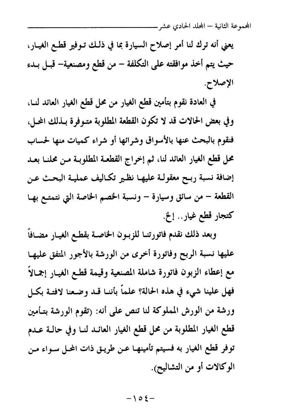 في العادة نقوم بتأمين قطع الغيار من محل قطع الغيار العائد لنا، وفي بعض الحالات قد لا تكون القطعة المطلوبة متوفرة بذلك المحل، فنقوم بالبحث عنها بالأسواق وشرائها أو شراء كميات منها لحساب محل قطع الغيار العائد لنا، ثم إخراج القطعة المطلوبة من محلنا بعد إضافة نسبة ربح معقولة عليها نظير تكاليف عملية البحث عن القطعة ـ من سائق وسيارة ـ ونسبة الخصم الخاصة التي نتمتع بها كتجار قطع غيار.. إلخ.
