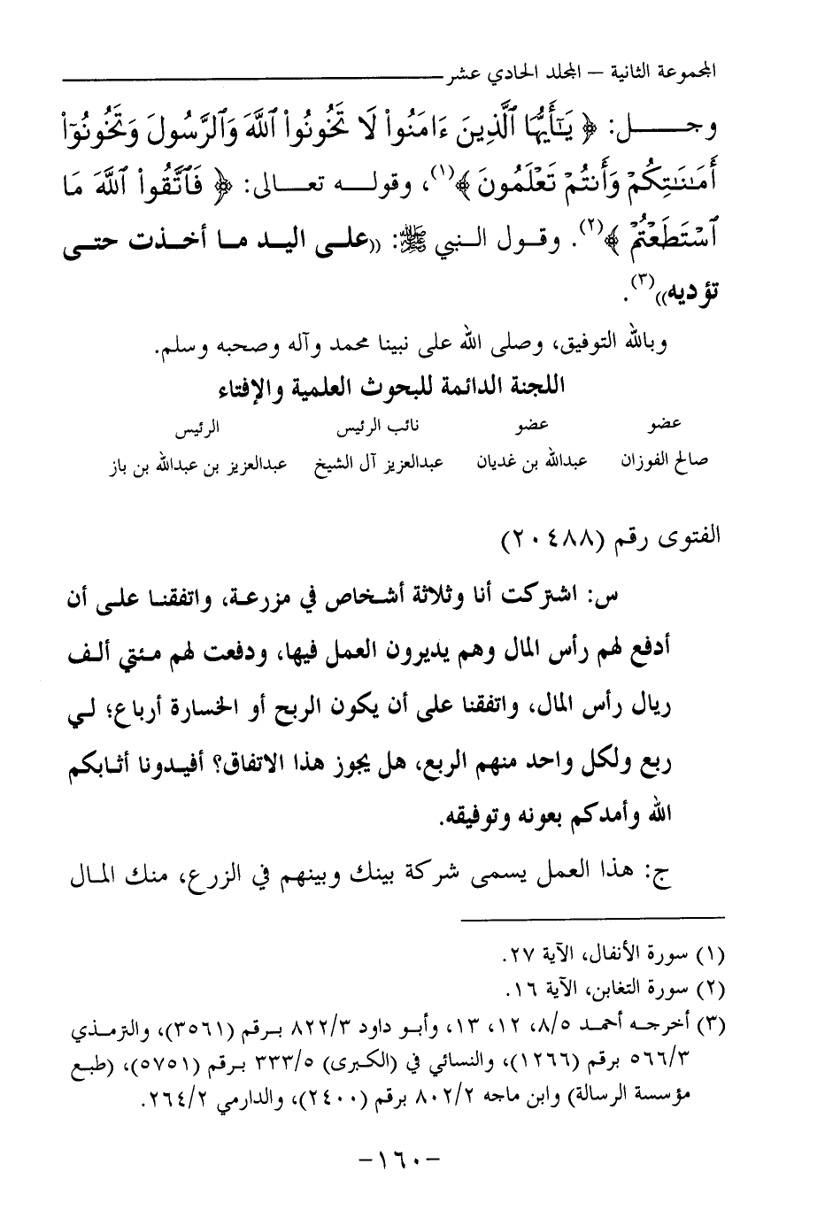 س: اشتركت أنا وثلاثة أشخاص في مزرعة، واتفقنا على أن أدفع لهم رأس المال وهم يديرون العمل فيها، ودفعت لهم مائتي ألف ريال رأس المال، واتفقنا على أن يكون الربح أو الخسارة أرباعا، لي ربع ولكل واحد منهم الربع، هل يجوز هذا الاتفاق؟ أفيدونا أثابكم الله وأمدكم بعونه وتوفيقه.