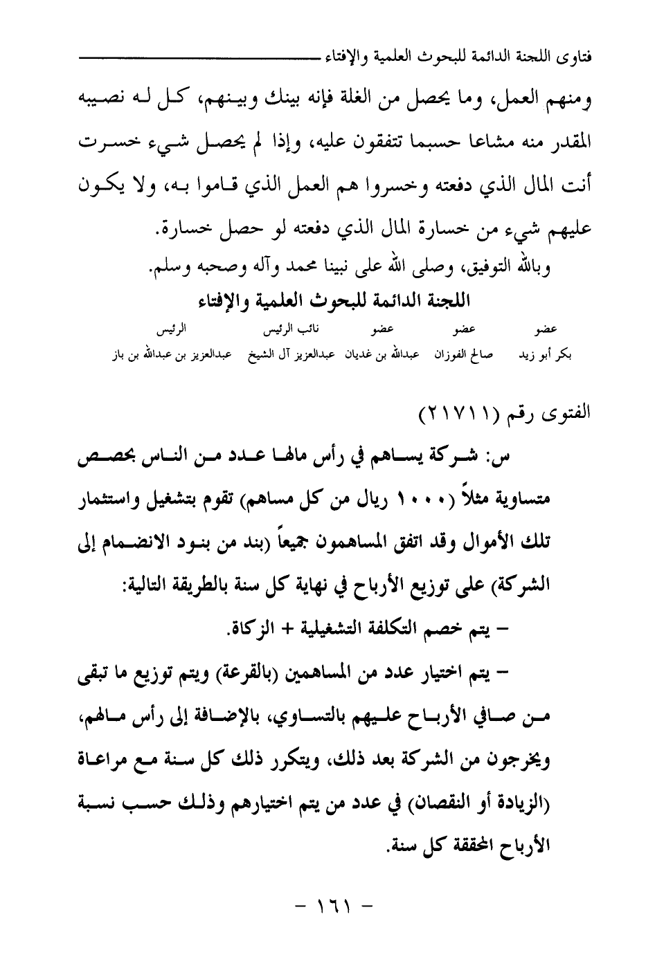 س: شركة يساهم في رأس مالها عدد من الناس بحصص متساوية مثلا (1000 ريال من كل مساهم) تقوم بتشغيل واستثمار تلك الأموال وقد اتفق المساهمون جميعا (بند من بنود الانضمام إلى الشركة) على توزيع الأرباح في نهاية كل سنة بالطريقة التالية: