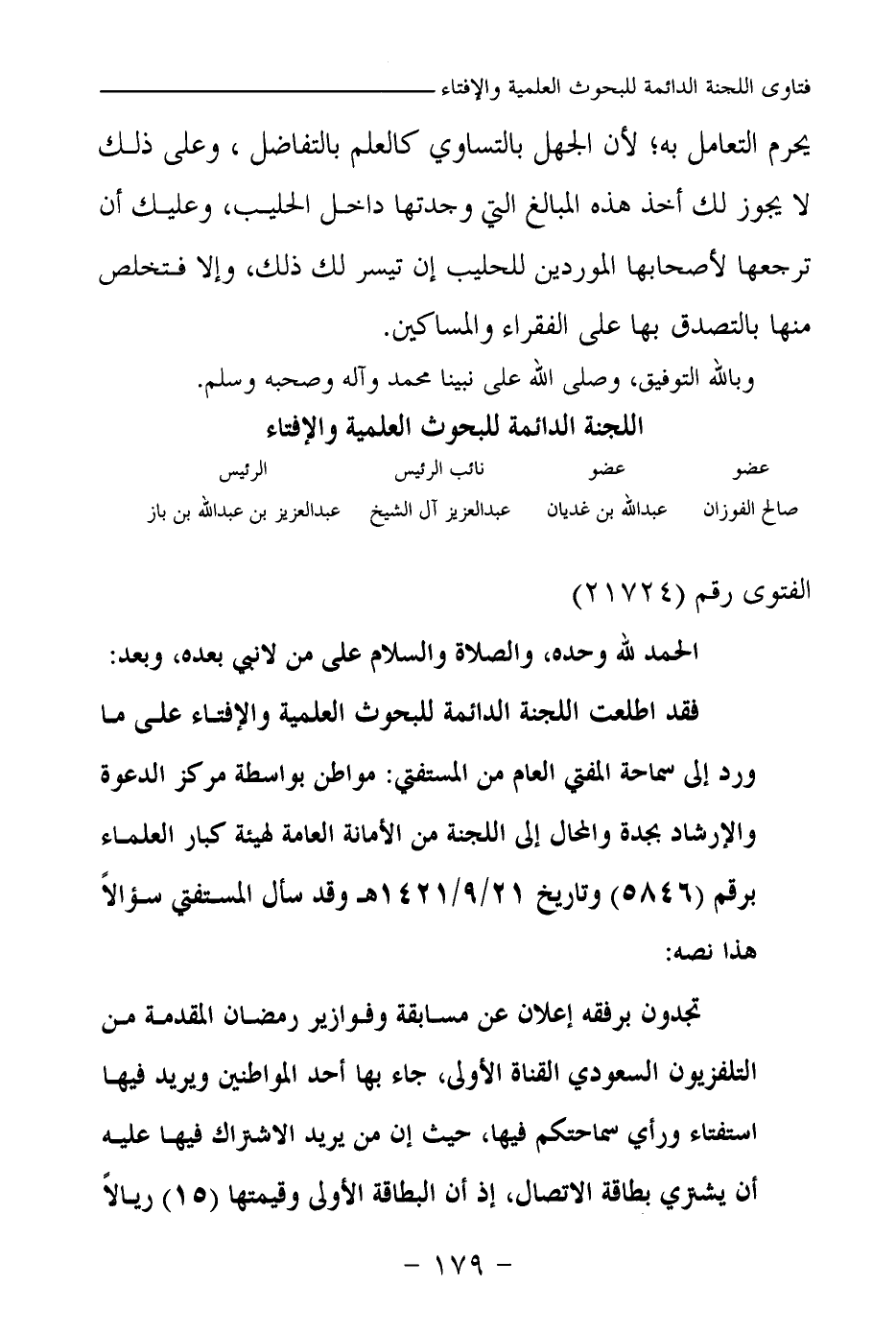 تجدون برفقه إعلان عن مسابقة وفوازير رمضان المقدمة من التلفزيون السعودي القناة الأولى، جاء بها أحد المواطنين ويريد فيها استفتاء ورأي سماحتكم فيها، حيث إن من يريد الاشتراك فيها عليه أن يشتري بطاقة الاتصال، إذ أن البطاقة الأولى وقيمتها (15) ريالا