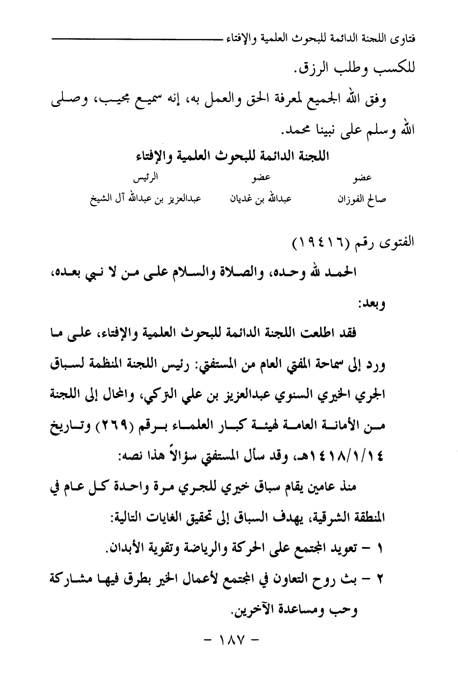 فقد اطلعت اللجنة الدائمة للبحوث العلمية والإفتاء على ما ورد إلى سماحة المفتي العام من المستفتي: رئيس اللجنة المنظمة لسباق الجري الخيري السنوي عبد العزيز بن علي التركي، والمحال إلى اللجنة من الأمانة العامة لهيئة كبار العلماء برقم (269) وتاريخ 14\1\1418هـ، وقد سأل المستفتي سؤالا هذا نصه: