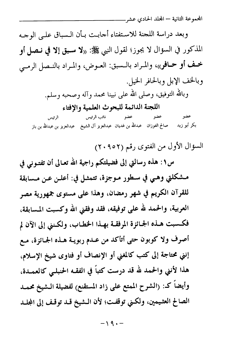 وبعد دراسة اللجنة للاستفتاء أجابت بأن السباق على الوجه المذكور في السؤال لا يجوز؛ لقول النبي - صلى الله عليه وسلم - «لا سبق إلا في نصل أو خف أو حافر (¬1) » ، والمراد بالسبق: العوض، والمراد بالنصل الرمي وبالخف الإبل وبالحافر الخيل.
