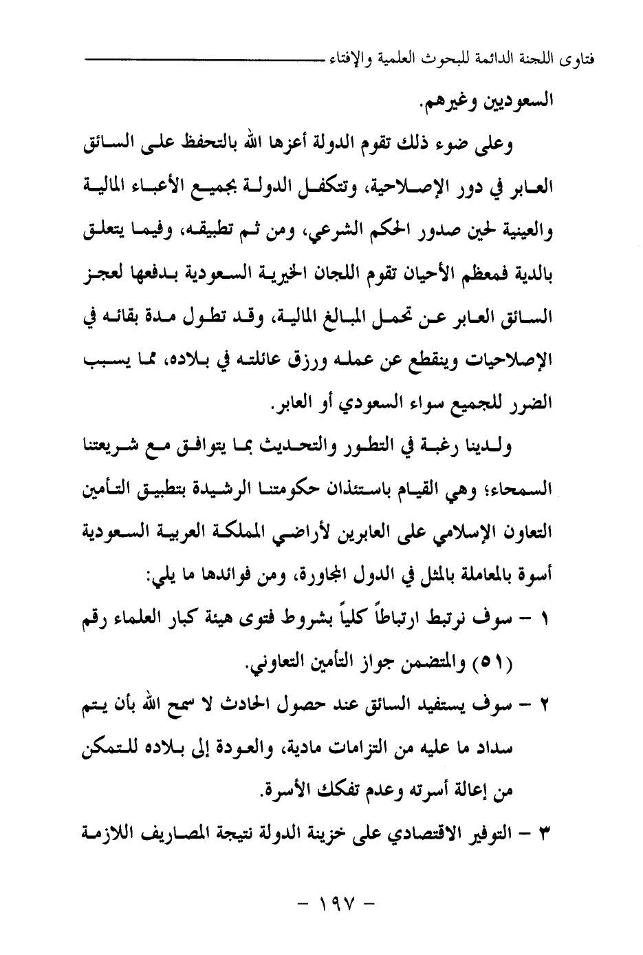 ولدينا رغبة في التطور والتحديث بما يتوافق مع شريعتنا السمحاء؛ وهي القيام باستئذان حكومتنا الرشيدة بتطبيق التأمين التعاون الإسلامي على العابرين لأراضي المملكة العربية السعودية أسوة بالمعاملة بالمثل في الدول المجاورة، ومن فوائدها ما يلي:
