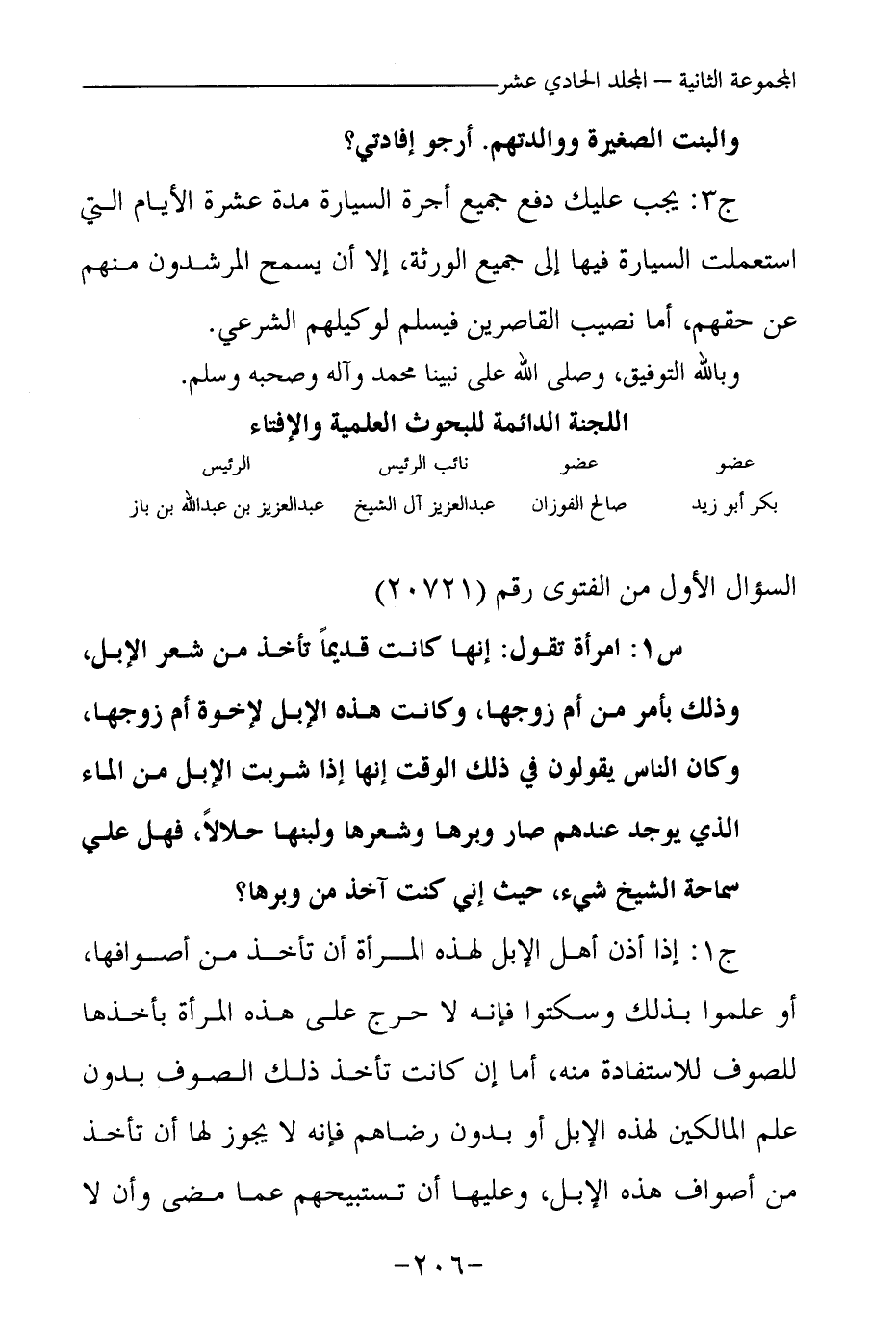 ج1: إذا أذن أهل الإبل لهذه المرأة أن تأخذ من أصوافها، أو علموا بذلك وسكتوا فإنه لا حرج على هذه المرأة بأخذها للصوف للاستفادة منه، أما إن كانت تأخذ ذلك الصوف بدون علم المالكين لهذه الإبل أو بدون رضاهم فإنه لا يجوز لها أن تأخذ من أصواف هذه الإبل، وعليها أن تستبيحهم عما مضى وأن لا