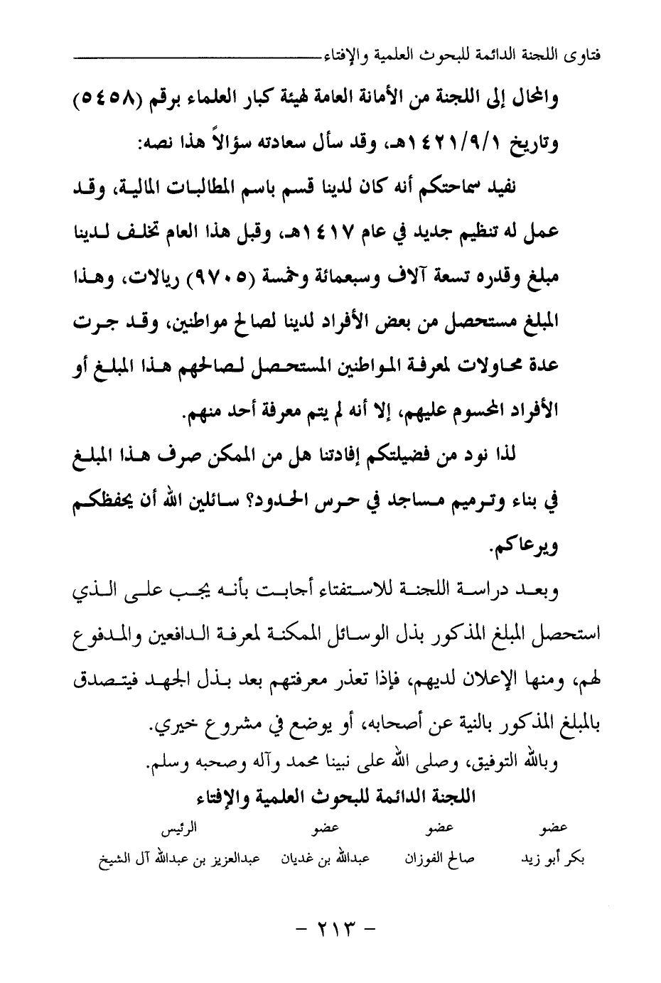 وبعد دراسة اللجنة للاستفتاء أجابت بأنه يجب على الذي استحصل المبلغ المذكور بذل الوسائل الممكنة لمعرفة الدافعين والمدفوع لهم، ومنها الإعلان لديهم، فإذا تعذر معرفتهم بعد بذل الجهد فيتصدق بالمبلغ المذكور بالنية عن أصحابه، أو يوضع في مشروع خيري.