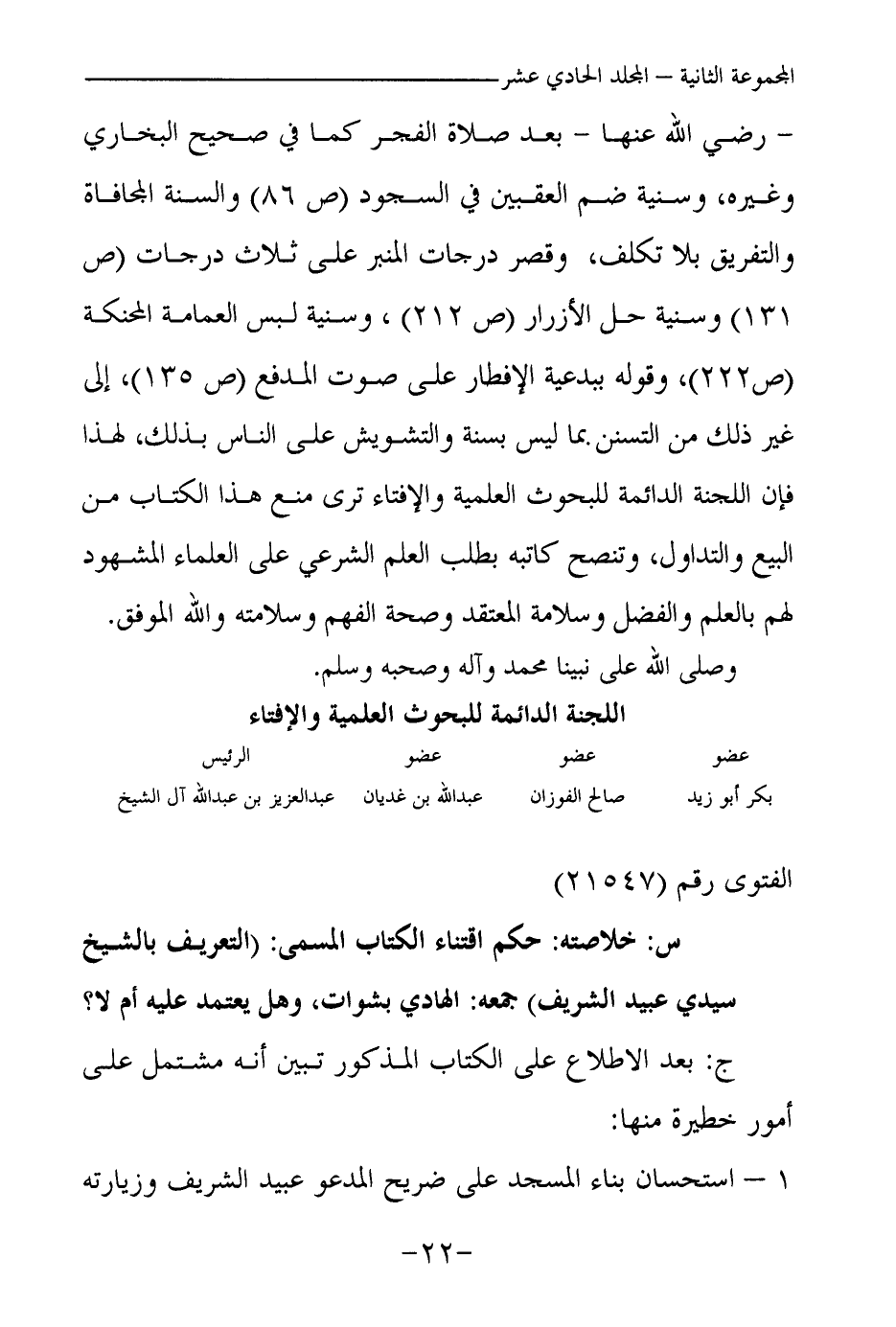 ـ رضي الله عنها ـ بعد صلاة الفجر كما في صحيح البخاري وغيره، وسنية ضم العقبين في السجود (ص86) والسنة المجافاة والتفريق بلا تكلف، وقصر درجات المنبر على ثلاث درجات (ص131) وسنية حل الأزرار (ص212) ، وسنية لبس العمامة المحنكة (ص222) ، وقوله ببدعية الإفطار على صوت المدفع (ص 135) ، إلى غير ذلك من التسنن بما ليس بسنة والتشويش على الناس بذلك، لهذا فإن اللجنة الدائمة للبحوث العلمية والإفتاء ترى منع هذا الكتاب من البيع والتداول، وتنصح كاتبه بطلب العلم الشرعي على العلماء المشهود لهم بالعلم والفضل وسلامة المعتقد وصحة الفهم وسلامته والله الموفق.