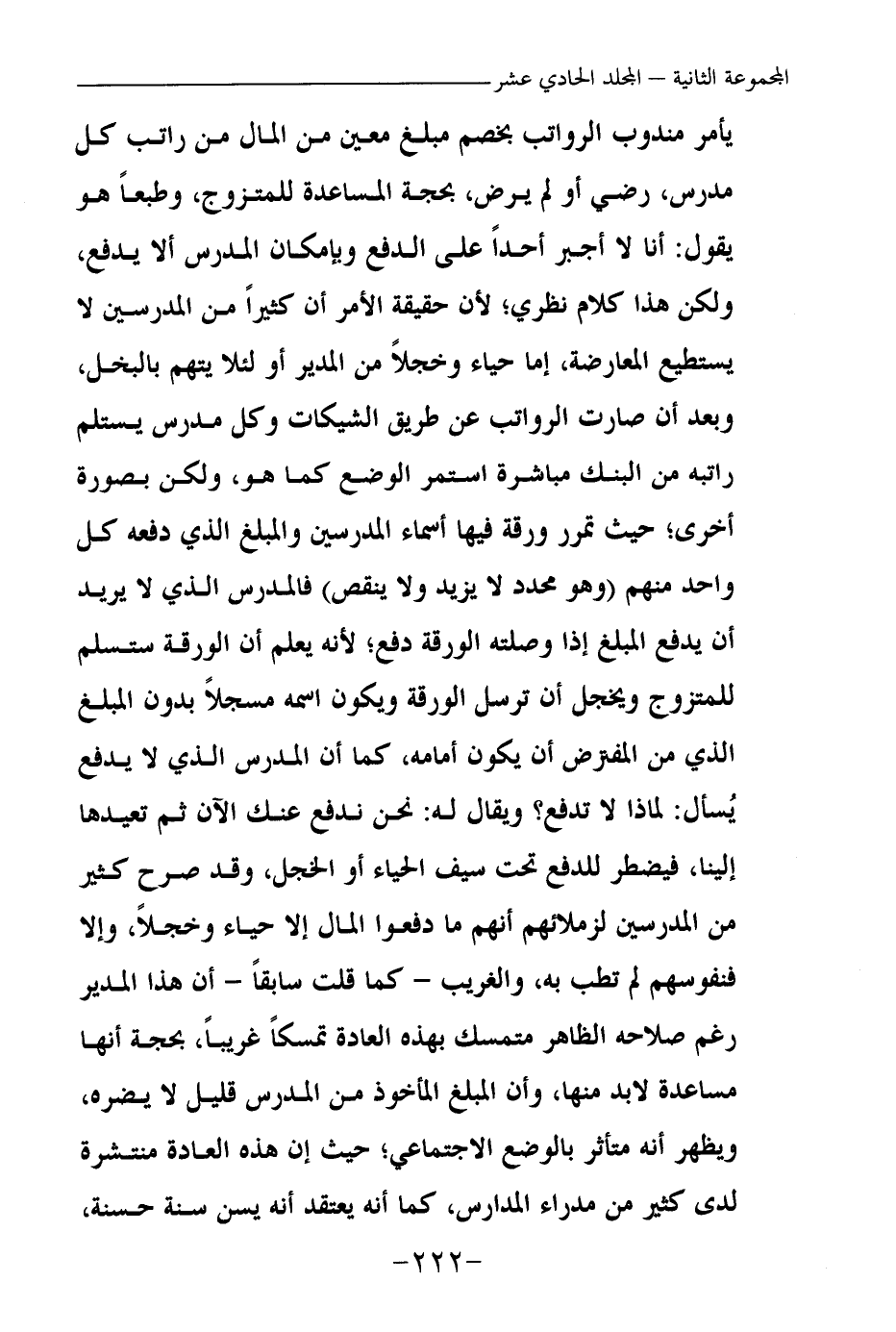 يأمر مندوب الرواتب بخصم مبلغ معين من المال من راتب كل مدرس، رضي أو لم يرض، بحجة المساعدة للمتزوج، وطبعا هو يقول: أنا لا أجبر أحدا على الدفع وبإمكان المدرس ألا يدفع، ولكن هذا كلام نظري؛ لأن حقيقة الأمر أن كثيرا من المدرسين لا يستطيع المعارضة، إما حياء وخجلا من المدير أو لئلا يتهم بالبخل، وبعد أن صارت الرواتب عن طريق الشيكات وكل مدرس يستلم راتبه من البنك مباشرة استمر الوضع كما هو، ولكن بصورة أخرى؛ حيث تمرر ورقة فيها أسماء المدرسين والمبلغ الذي دفعه كل واحد منهم وهو محدد لا يزيد ولا ينقص فالمدرس الذي لا يريد أن يدفع المبلغ إذا وصلته الورقة دفع؛ لأنه يعلم أن الورقة ستسلم للمتزوج ويخجل أن ترسل الورقة ويكون اسمه مسجلا بدون المبلغ الذي من المفترض أن يكون أمامه، كما أن المدرس الذي لا يدفع يسأل: لماذا لا تدفع؟ ويقال له: نحن ندفع عنك الآن ثم تعيدها إلينا، فيضطر للدفع تحت سيف الحياء أو الخجل، وقد صرح كثير من المدرسين لزملائهم أنهم ما دفعوا المال إلا حياء وخجلا، وإلا فنفوسهم لم تطب به، والغريب ـ كما قلت سابقا ـ أن هذا المدير رغم صلاحه الظاهر متمسك بهذه العادة تمسكا غريبا، بحجة أنها مساعدة لا بد منها، وأن المبلغ المأخوذ من المدرس قليل لا يضره، ويظهر أنه متأثر بالوضع الاجتماعي؛ حيث إن هذه العادة منتشرة لدى كثير من مدراء المدارس، كما أنه يعتقد أنه يسن سنة حسنة،