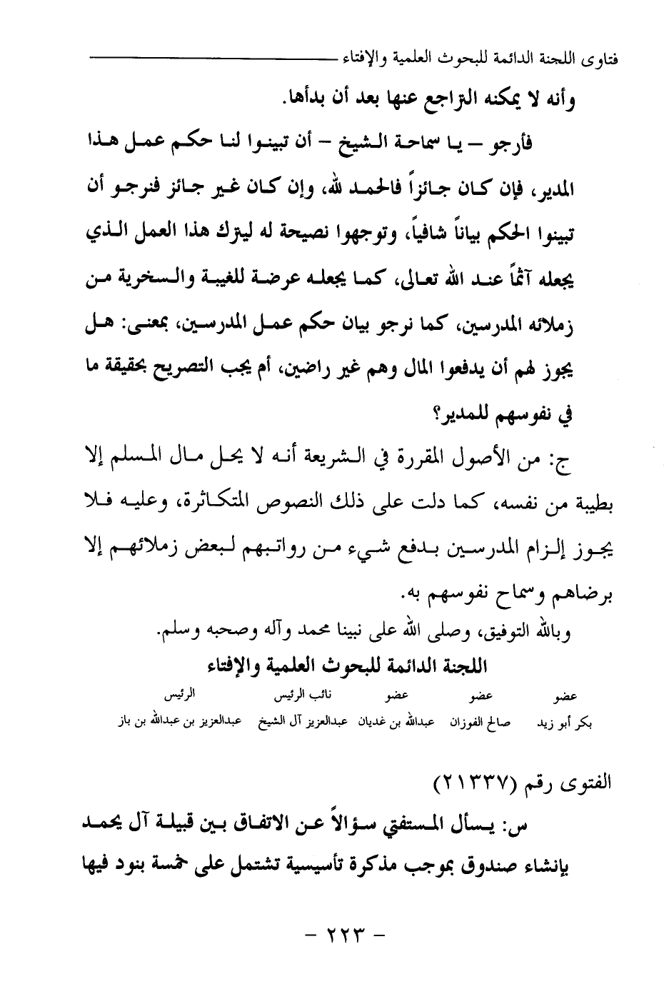 ج: من الأصول المقررة في الشريعة أنه لا يحل مال المسلم إلا بطيبة من نفسه، كما دلت على ذلك النصوص المتكاثرة، وعليه فلا يجوز إلزام المدرسين بدفع شيء من رواتبهم لبعض زملائهم إلا برضاهم وسماح نفوسهم به.
