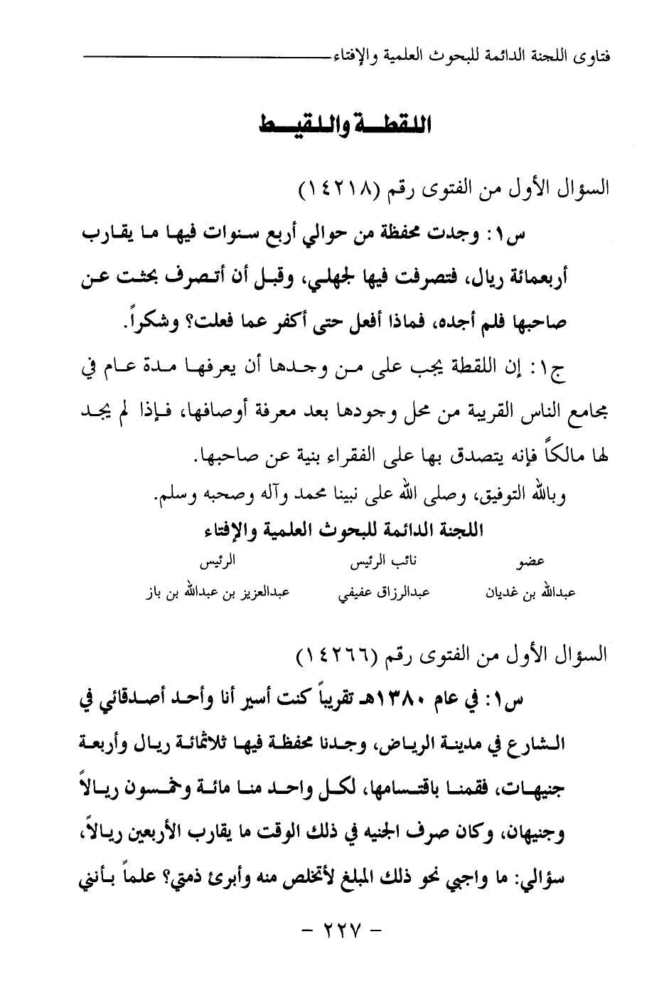 س 1: في عام 1380 هـ تقريبا كنت أسير أنا وأحد أصدقائي في الشارع في مدينة الرياض، وجدنا محفظة فيها ثلاثمائة ريال وأربعة جنيهات، فقمنا باقتسامها، لكل واحد منا مائة وخمسون ريالا وجنيهان، وكان صرف الجنيه في ذلك الوقت ما يقارب الأربعين ريالا، سؤالي: ما واجبي نحو ذلك المبلغ لأتخلص منه وأبرئ ذمتي؟ علما بأنني