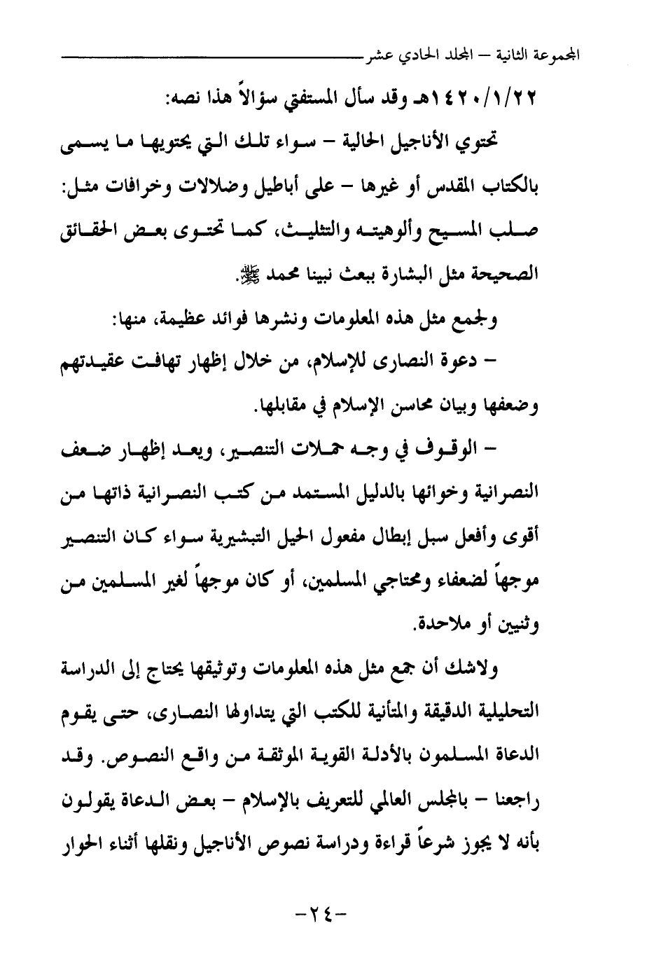 ولا شك أن جمع مثل هذه المعلومات وتوثيقها يحتاج إلى الدراسة التحليلية الدقيقة والمتأنية للكتب التي يتداولها النصارى، حتى يقوم الدعاة المسلمون بالأدلة القوية الموثقة من واقع النصوص. وقد راجعنا ـ بالمجلس العالمي للتعريف بالإسلام ـ بعض الدعاة يقولون بأنه لا يجوز شرعا قراءة ودراسة نصوص الأناجيل ونقلها أثناء الحوار