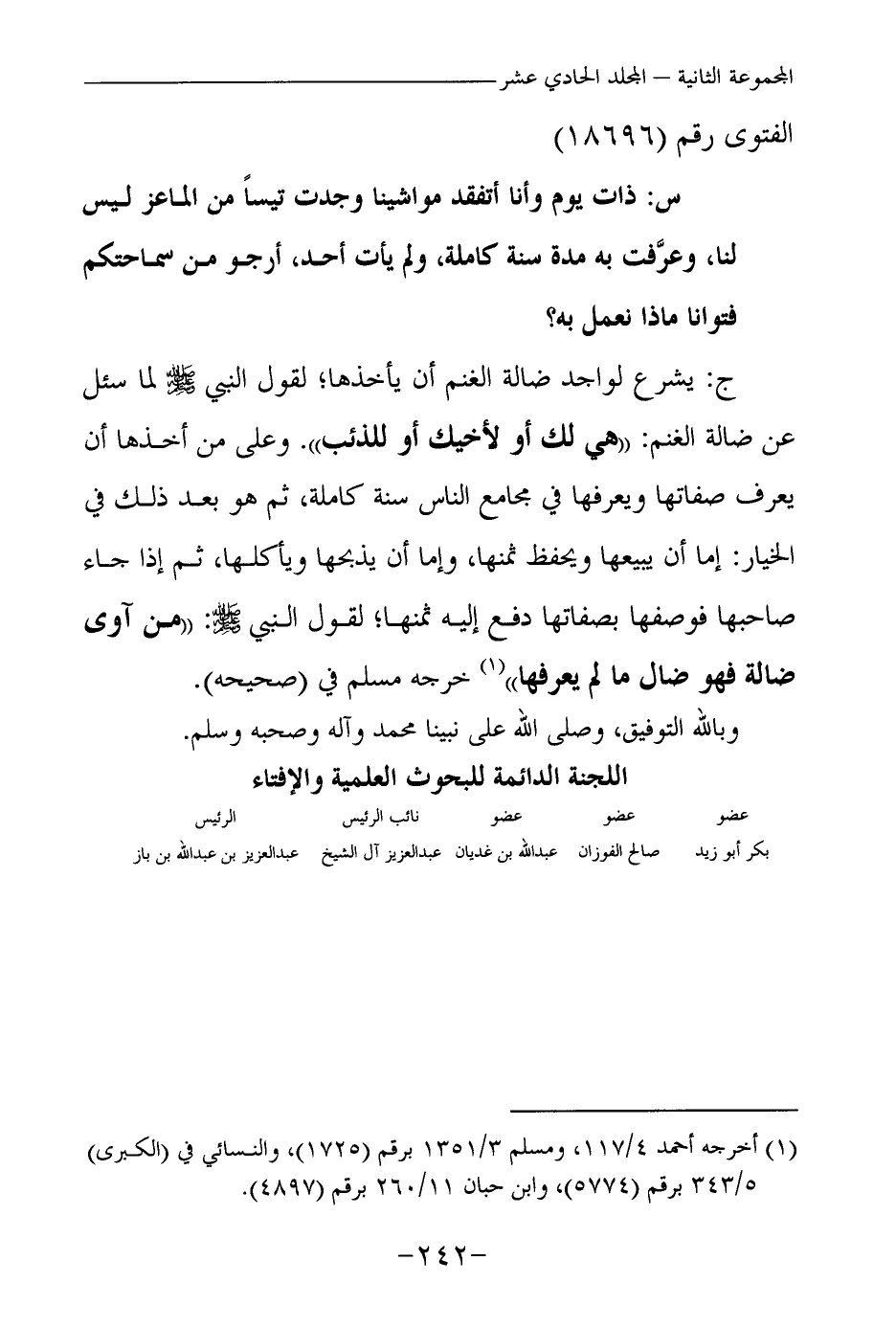 س: ذات يوم وأنا أتفقد مواشينا وجدت تيسا من الماعز ليس لنا وعرفت به مدة سنة كاملة، ولم يأت أحد، أرجو من سماحتكم فتوانا ماذا نعمل به؟