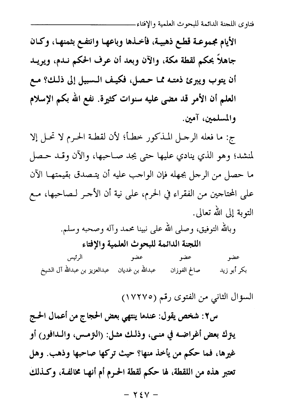 ج: ما فعله الرجل المذكور خطأ؛ لأن لقطة الحرم لا تحل إلا لمنشد؛ وهو الذي ينادي عليها حتى يجد صاحبها، والآن وقد حصل ما حصل من الرجل بجهله فإن الواجب عليه أن يتصدق بقيمتها الآن على المحتاجين من الفقراء في الحرم، على نية أن الأجر لصاحبها، مع التوبة إلى الله تعالى.