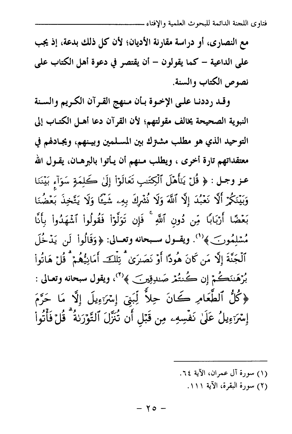 وقد رددنا على الأخوة بأن منهج القرآن الكريم والسنة النبوية الصحيحة يخالف مقولتهم، لأن القرآن دعا أهل الكتاب إلى التوحيد الذي هو مطلب مشترك بين المسلمين وبينهم، ويجادلهم في معتقداتهم تارة أخرى، ويطلب منهم أن يأتوا بالبرهان، يقول الله عز وجل: {قُلْ يَاأَهْلَ الْكِتَابِ تَعَالَوْا إِلَى كَلِمَةٍ سَوَاءٍ بَيْنَنَا وَبَيْنَكُمْ أَلَّا نَعْبُدَ إِلَّا اللَّهَ وَلَا نُشْرِكَ بِهِ شَيْئًا وَلَا يَتَّخِذَ بَعْضُنَا بَعْضًا أَرْبَابًا مِنْ دُونِ اللَّهِ فَإِنْ تَوَلَّوْا فَقُولُوا اشْهَدُوا بِأَنَّا مُسْلِمُونَ} (¬1) ويقول سبحانه وتعالى: {وَقَالُوا لَنْ يَدْخُلَ الْجَنَّةَ إِلَّا مَنْ كَانَ هُودًا أَوْ نَصَارَى تِلْكَ أَمَانِيُّهُمْ قُلْ هَاتُوا بُرْهَانَكُمْ إِنْ كُنْتُمْ صَادِقِينَ} (¬2) . ويقول سبحانه وتعالى: {كُلُّ الطَّعَامِ كَانَ حِلًّا لِبَنِي إِسْرَائِيلَ إِلَّا مَا حَرَّمَ إِسْرَائِيلُ عَلَى نَفْسِهِ مِنْ قَبْلِ أَنْ تُنَزَّلَ التَّوْرَاةُ قُلْ فَأْتُوا بِالتَّوْرَاةِ فَاتْلُوهَا إِنْ كُنْتُمْ صَادِقِينَ} (¬3) ،