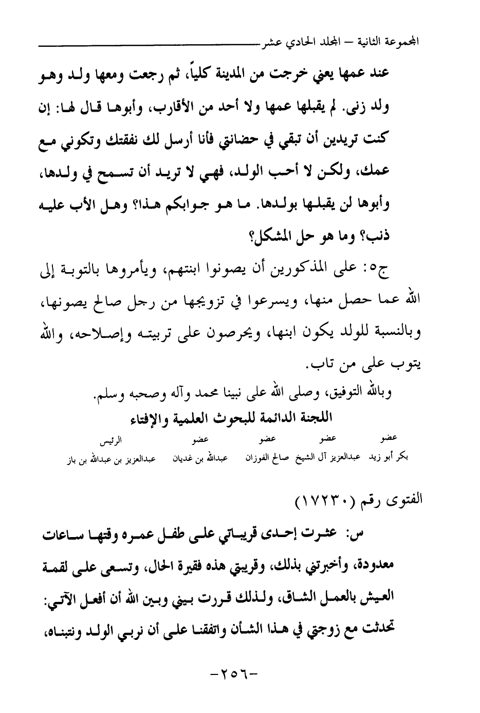 عند عمها يعني خرجت من المدينة كليا، ثم رجعت ومعها ولد وهو ولد زنى. ولم يقابلها عمها ولا أحد من الأقارب، وأبوها قال لها: إن كنت تريدين أن تبقي في حضانتي فأنا أرسل لك نفقتك وتكونين مع عمك، ولكن لا أحب الولد، فهي لا تريد أن تسمح في ولدها، وأبوها لن يقبلها بولدها. ما هو جوابكم هذا؟ وهل الأب عليه ذنب؟ وما هو حل المشكل؟