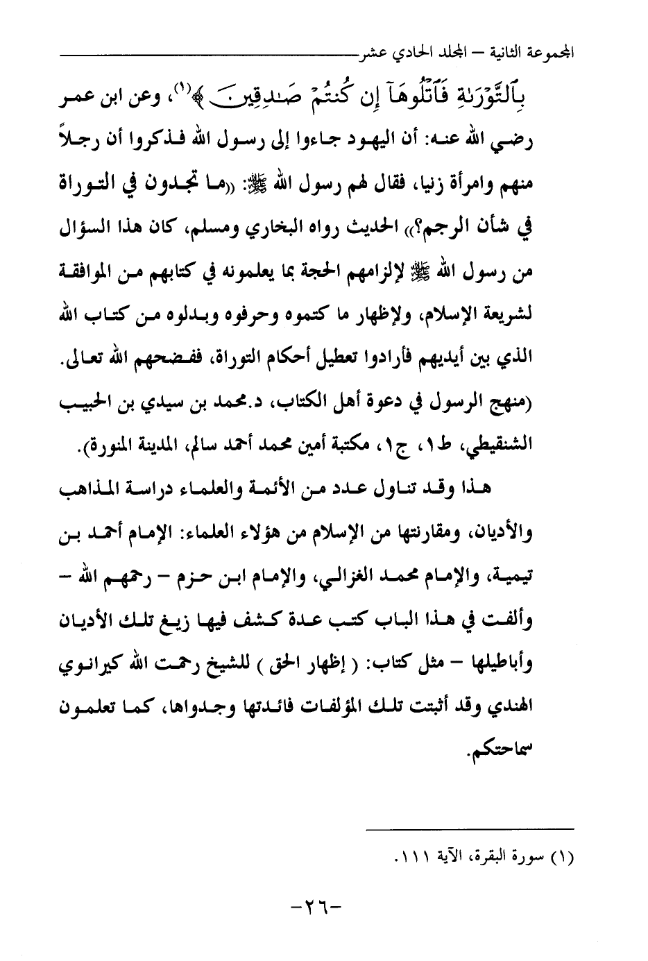 وعن ابن عمر رضي الله عنه: «أن اليهود جاءوا إلى رسول الله فذكروا أن رجلا منهم وامرأة زنيا فقال لهم رسول الله - صلى الله عليه وسلم - ما تجدون في التوارة في شأن الرجم؟ (¬1) » الحديث رواه البخاري ومسلم، كان هذا السؤال من رسول الله - صلى الله عليه وسلم - لإلزامهم الحجة بما يعلمونه في كتابهم من الموافقة لشريعة الإسلام، ولإظهار ما كتموه وحرفوه وبدلوه من كتاب الله الذي بين أيديهم فأرادوا تعطيل أحكام التوراة، ففضحهم الله تعالى.