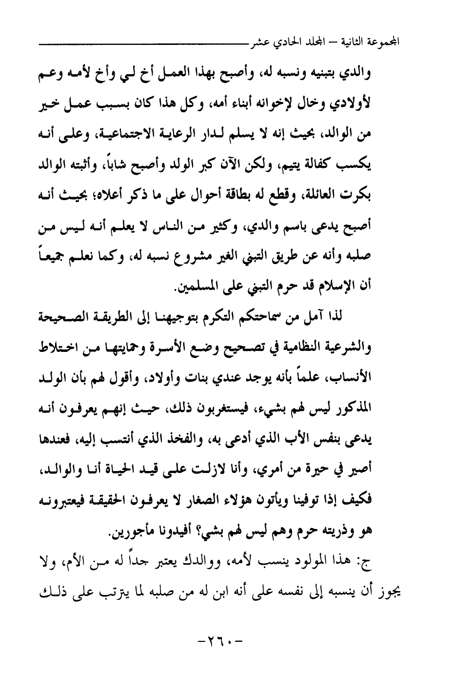 لذا آمل من سماحتكم التكرم بتوجيهنا إلى الطريقة الصحيحة والشرعية النظامية في تصحيح وضع الأسرة وحمايتها من اختلاط الأنساب، علما بأنه يوجد عندي بنات وأولاد، وأقول لهم بأن الولد المذكور ليس لهم بشيء، فيستغربون ذلك، حيث إنهم يعرفون أنه يدعى بنفس الأب الذي أدعى به، والفخذ الذي أنتسب إليه فعندها أصير في حيرة من أمري وأنا لا زلت على قيد الحياة أنا والوالد، فكيف إذا توفينا ويأتونا هؤلاء الصغار لا يعرفون الحقيقة فيعتبرونه هو وذريته حرم وهم ليس لهم بشيء؟ أفيدونا مأجورين.