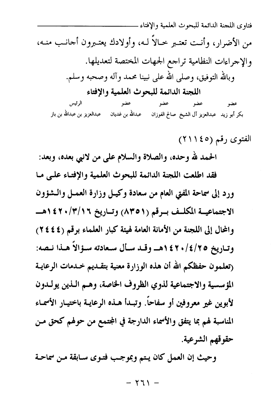 فقد اطلعت اللجنة الدائمة للبحوث العلمية والإفتاء على ما ورد إلى سماحة المفتي العام من سعادة وكيل وزارة العمل والشؤون الاجتماعية المكلف برقم (8351) وتاريخ 16\3\1420هـ والمحال إلى اللجنة من الأمانة العامة لهيئة كبار العلماء برقم (2444) وتاريخ 25\4\1420هـ وقد سأل سعادته سؤالا هذا نصه: (تعلمون حفظكم الله أن هذه الوزارة معنية بتقديم خدمات الرعاية المؤسسية والاجتماعية لذوي الظروف الخاصة، وهم الذين يولدون لأبوين غير معروفين أو سفاحا. وتبدأ هذه الرعاية باختيار الأسماء المناسبة لهم بما يتفق والأسماء الدراجة في المجتمع من حولهم كحق من حقوقهم الشرعية.