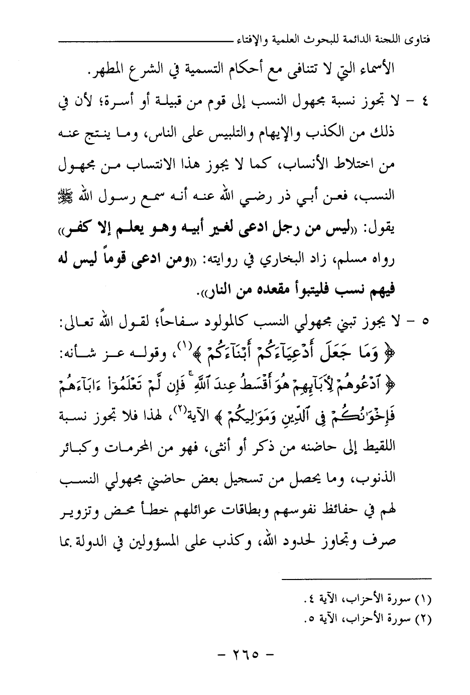 4- لا تجوز نسبة مجهول النسب إلى قوم من قبيلة أو أسرة؛ لأن في ذلك من الكذب والإيهام والتلبيس على الناس، وما ينتج عنه من اختلاط الأنساب، كما لا يجوز هذا الانتساب من مجهول النسب، فعن أبي ذر رضي الله عنه أنه سمع رسول الله - صلى الله عليه وسلم - يقول «ليس من رجل ادعى لغير أبيه وهو يعلم إلا كفر (¬1) » رواه مسلم، زاد البخاري في روايته: «ومن ادعى قوما ليس له فيهم نسب فليتبوأ مقعده من النار (¬2) » .