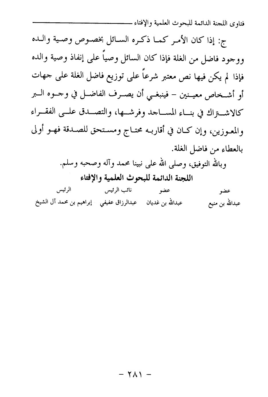 ج: إذا كان الأمر كما ذكره السائل بخصوص وصية والده ووجود فاضل من الغلة فإذا كان السائل وصيا على إنفاذ وصية والده فإذا لم يكن فيها نص معتبر شرعا على توزيع فاضل الغلة على جهات أو أشخاص معينين ـ فينبغي أن يصرف الفاضل في وجوه البر كالاشتراك في بناء المساجد وفرشها، والتصدق على الفقراء والمعوزين، وإن كان في أقاربه محتاج ومستحق للصدقة فهو أولى بالعطاء من فاضل الغلة.