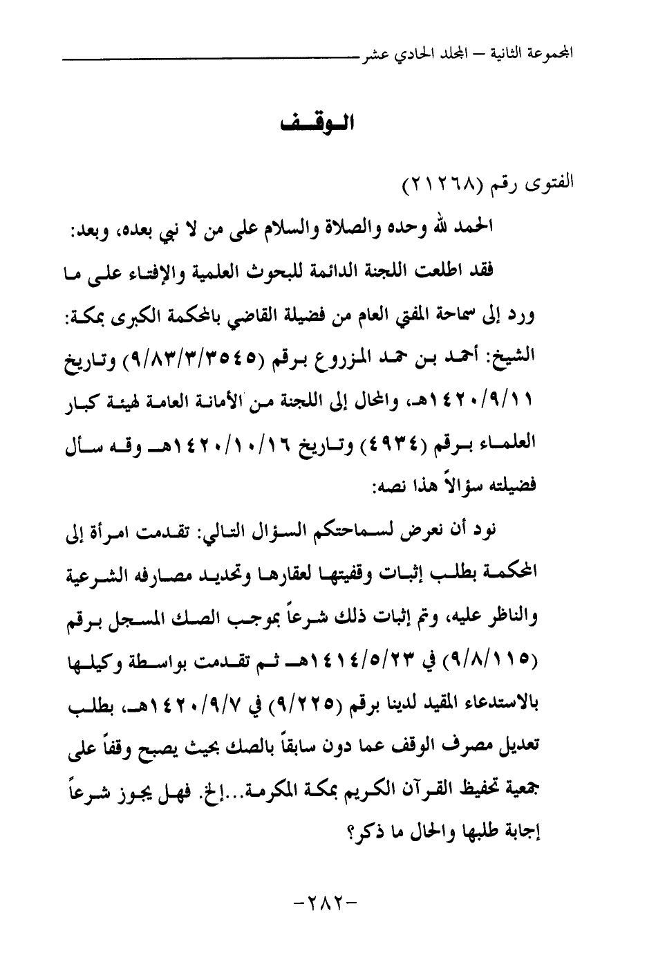 فقد اطلعت اللجنة الدائمة للبحوث العلمية والإفتاء على ما ورد إلى سماحة المفتي العام من فضيلة القاضي بالمحكمة الكبرى بمكة: الشيخ: أحمد بن حمد المزروع برقم (3545\3\83\9) وتاريخ 11\9\1420 هـ، والمحال إلى اللجنة من الأمانة العامة لهيئة كبار العلماء برقم (4934) وتاريخ 16\10\1420 هـ وقد سأل فضيلته سؤالا هذا نصه: