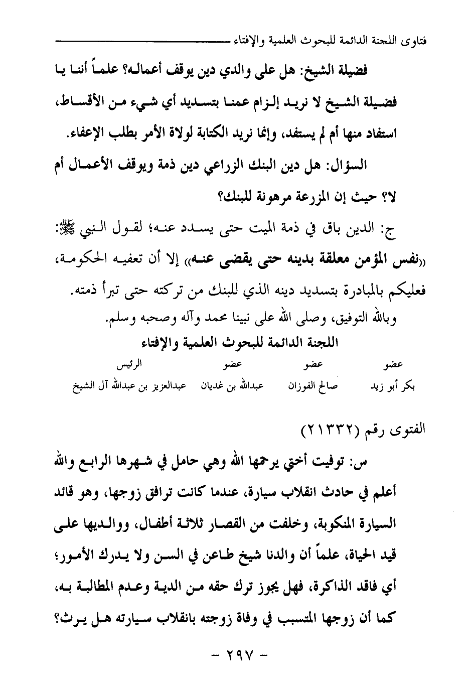 ج: الدين باق في ذمة الميت حتى يسدد عنه؛ لقول النبي - صلى الله عليه وسلم -: «نفس المؤمن معلقة بدينه حتى يقضى عنه (¬1) » إلا أن تعفيه الحكومة، فعليكم بالمبادرة بتسديد دينه الذي للبنك من تركته حتى تبرأ ذمته.