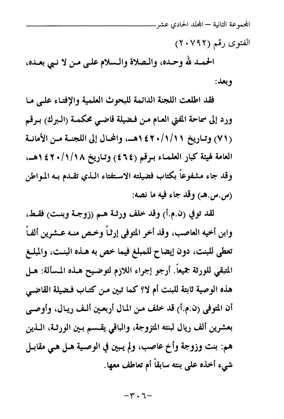 فقد اطلعت اللجنة الدائمة للبحوث العلمية والإفتاء على ما ورد إلى سماحة المفتي العام من فضيلة قاضي محكمة (البرك) برقم (71) وتاريخ 11\1\1420هـ، والمحال إلى اللجنة من الأمانة العامة لهيئة كبار العلماء برقم (464) وتاريخ 18\1\1420هـ، وقد جاء مشفوعا بكتاب فضيلته الاستفتاء الذي تقدم به المواطن (س. س. هـ) وقد جاء فيه ما نصه: