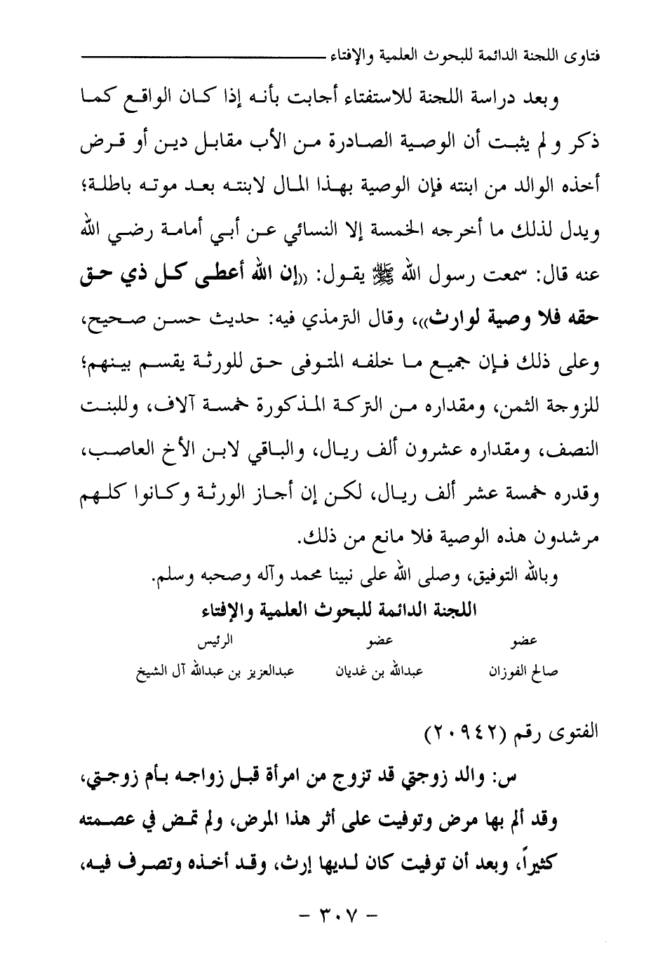 وبعد دراسة اللجنة للاستفتاء أجابت بأنه إذا كان الواقع كما ذكر ولم يثبت أن الوصية الصادرة من الأب مقابل دين أو قرض أخذه الوالد من ابنته فإن الوصية بهذا المال لابنته بعد موته باطلة؛ ويدل لذلك ما أخرجه الخمسة إلا النسائي عن أبي أمامة رضي الله عنه قال: سمعت رسول الله - صلى الله عليه وسلم - يقول: «إن الله أعطى كل ذي حق حقه فلا وصية لوارث (¬1) » وقال الترمذي فيه: حديث حسن صحيح، وعلى ذلك فإن جميع ما خلفه المتوفى حق للورثة يقسم بينهم؛ للزوجة الثمن ومقداره من التركة المذكورة خمسة آلاف، وللبنت النصف، ومقداره عشرون ألف ريال، والباقي لابن الأخ العاصب، وقدره خمسة عشر ألف ريال، لكن إن أجاز الورثة وكانوا كلهم مرشدين هذه الوصية فلا مانع من ذلك.