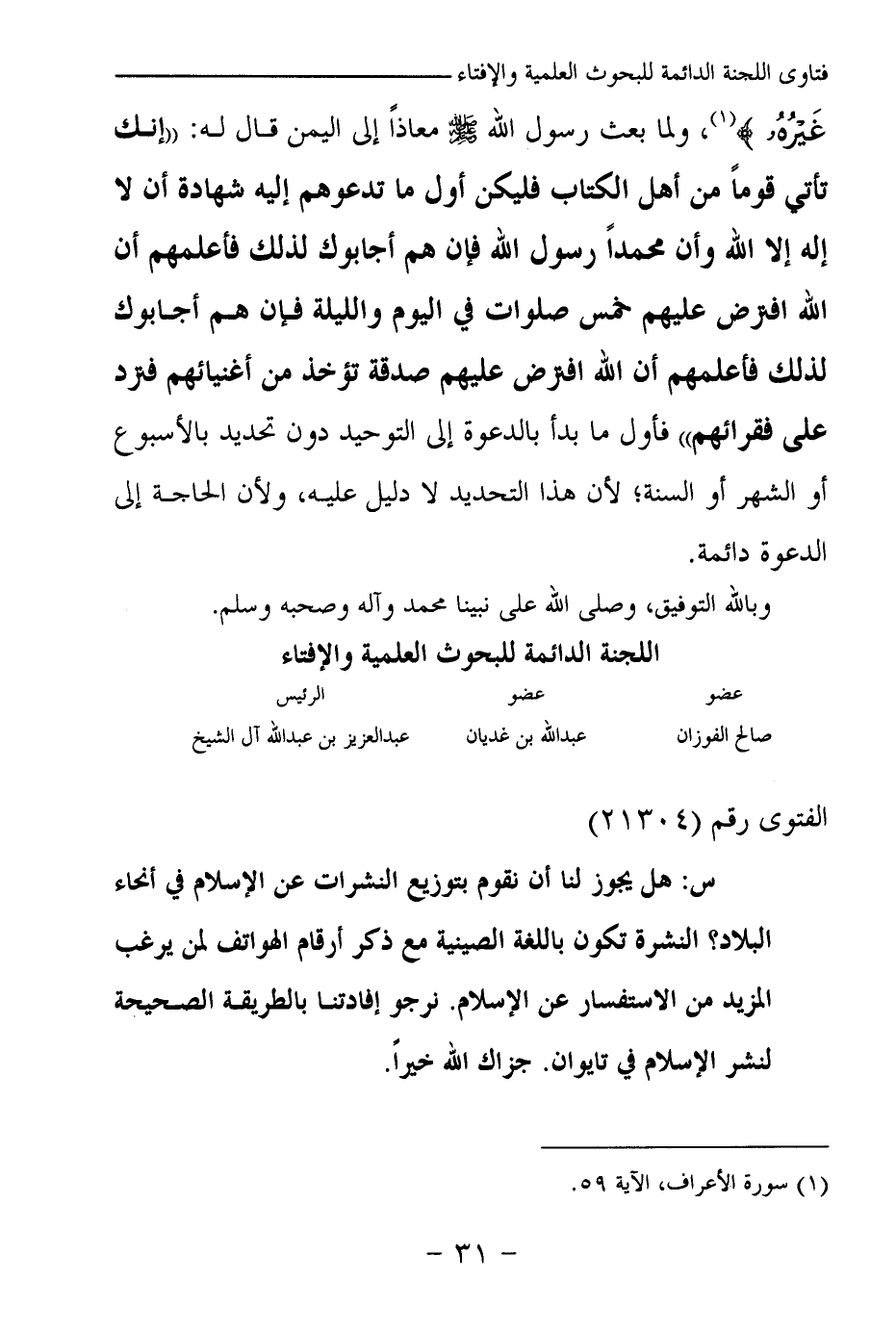 «ولما بعث رسول الله - صلى الله عليه وسلم - معاذا إلى اليمن قال له: إنك تأتي قوما من أهل الكتاب فليكن أول ما تدعوهم إليه شهادة أن لا إله إلا الله وأن محمدا رسول الله فإن هم أجابوك لذلك فأعلمهم أن الله افترض عليهم خمس صلوات في اليوم والليلة فإن هم أجابوك لذلك فأعلمهم أن الله افترض عليهم صدقة تؤخذ من أغنيائهم فترد على فقرائهم (¬1) » فأول ما بدأ بالدعوة إلى التوحيد دون تحديد بالأسبوع أو الشهر أو السنة؛ لأن هذا التحديد لا دليل عليه، ولأن الحاجة إلى الدعوة دائمة.