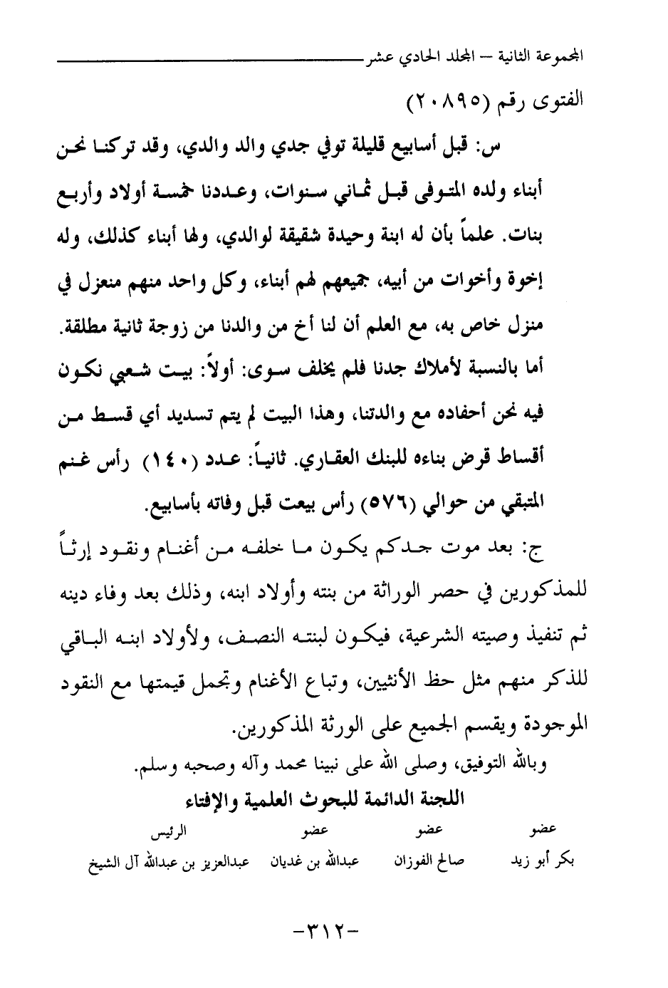 س: قبل أسابيع قليلة توفي جدي والد والدي، وقد تركنا نحن أبناء ولده المتوفى قبل ثماني سنوات، وعددنا خمسة أولاد وأربع بنات. علما بأن له ابنة وحيدة شقيقة لوالدي، ولها أبناء كذلك، وله إخوة وأخوات من أبيه، جمعيهم لهم أبناء، وكل واحد منهم منعزل في منزل خاص به، مع العلم أن لنا أخا من والدنا من زوجة ثانية مطلقة. أما بالنسبة لأملاك جدنا فلم يخلف سوى: أولا: بيت شعبي نكون فيه نحن أحفاده مع والدتنا، وهذا البيت لم يتم تسديد أي قسط من أقساط قرض بنائه للبنك العقاري. ثانيا: عدد (140) رأس غنم المتبقي من حوالي (575) رأس بيعت قبل وفاته بأسابيع.