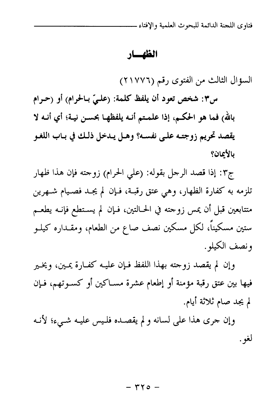 ج3: إذا قصد الرجل بقوله (علي الحرام) زوجته فإن هذا ظهار تلزمه به كفارة الظهار، وهي عتق رقبة، فإن لم يجد فصيام شهرين متتابعين قبل أن يمس زوجته في الحالتين، فإن لم يستطع فإنه يطعم ستين مسكينا، لكل مسكين نصف صاع من الطعام، ومقداره كيلو ونصف الكيلو.