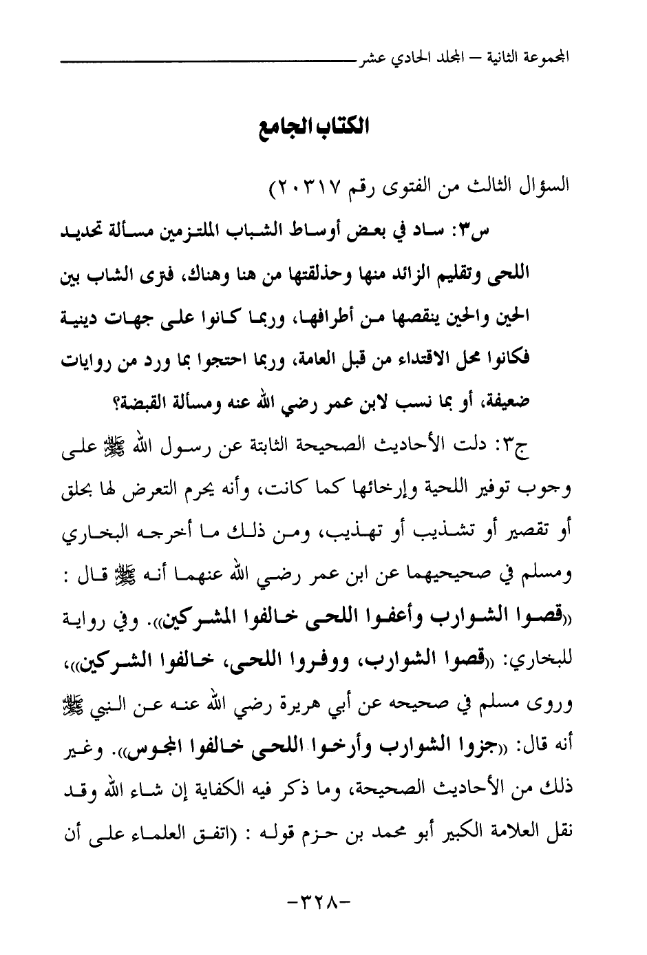س3: ساد في بعض أوساط الشباب الملتزمين مسألة تحديد اللحى وتقليم الزائد منه وحذلقتها من هنا وهناك، فترى الشاب بين الحين والحين ينقصها من أطرافها، وربما كانوا على جهات دينية فكانوا محل الاقتداء قبل العامة، وربما احتجوا بما ورد من روايات ضعيفة، أو بما نسب لابن عمر رضي الله عنه ومسألة القبضة؟