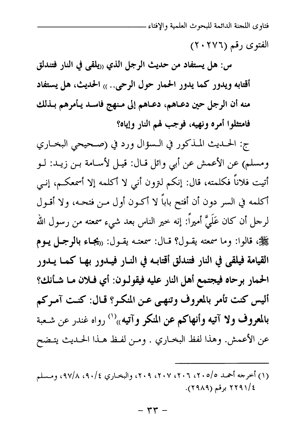 ج: الحديث المذكور في السؤال ورد في (صحيحي البخاري ومسلم) عن الأعمش عن أبي وائل قال: «قيل لأسامة بن زيد: لو أتيت فلانا فكلمته، قال: إنكم لترون أني لا أكلمه إلا أسمعكم، إني أكلمه في السر دون أن أفتح بابا لا أكون أول من فتحه، ولا أقول لرجل أن كان علي أميرا: إنه خير الناس بعد شيء سمعته من رسول الله صلى الله عليه وسلم، قالوا: وما سمعته يقول؟ قال: سمعته يقول: يجاء بالرجل يوم القيامة فيلقى في النار فتندلق أقتابه في النار فيدور بها كما يدور الحمار برحاه فيجتمع أهل النار عليه فيقولون: أي فلان ما شأنك؟ أليس كنت تأمر بالمعروف وتنهى عن المنكر؟ قال: كنت آمركم بالمعروف ولا آتيه وأنهاكم عن المنكر وآتيه (¬1) » رواه غندر عن شعبة عن الأعمش، وهذا لفظ البخاري. ومن لفظ هذا الحديث يتضح
