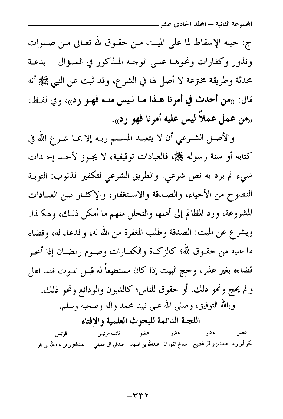 ج: حيلة الإسقاط لما على الميت من حقوق لله تعالى من صلوات ونذور وكفارات ونحوها على الوجه المذكور في السؤال ـ بدعة محدثة وطريقة مخترعة لا أصل لها في الشرع، وقد ثبت عن النبي - صلى الله عليه وسلم - أنه قال: «من أحدث في أمرنا هذا ما ليس منه فهو رد (¬1) » ، وفي لفظ: «من عمل عملا ليس عليه أمرنا فهو رد (¬2) » .