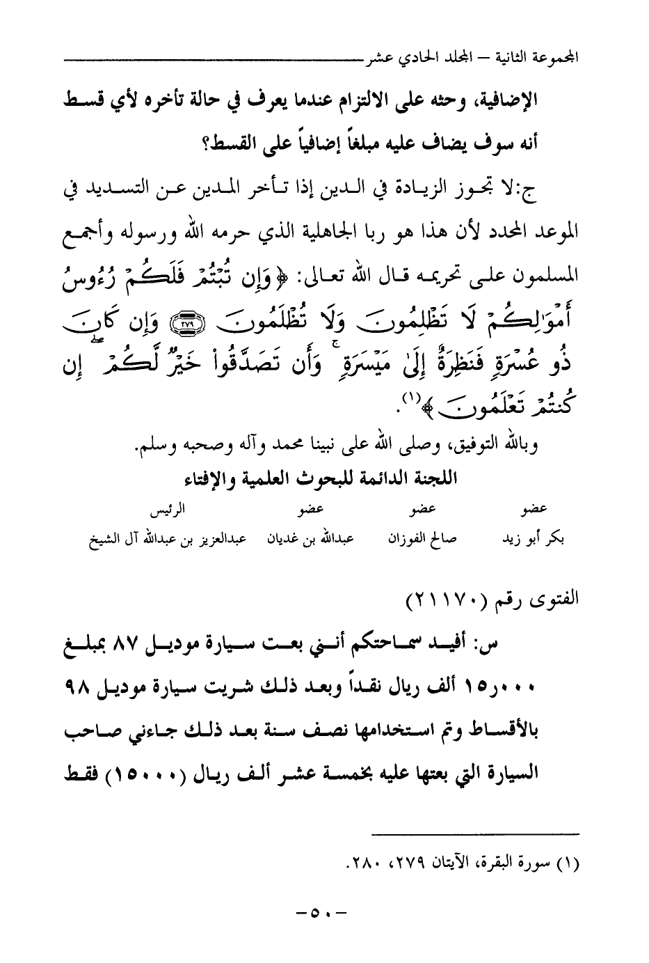 ج: لا تجوز الزيادة في الدين إذا تأخر المدين عن التسديد في الموعد المحدد لأن هذا هو ربا الجاهلية الذي حرمه الله ورسوله وأجمع المسلمون على تحريمه قال الله تعالى: {وَإِنْ تُبْتُمْ فَلَكُمْ رُءُوسُ أَمْوَالِكُمْ لَا تَظْلِمُونَ وَلَا تُظْلَمُونَ} (¬1) {وَإِنْ كَانَ ذُو عُسْرَةٍ فَنَظِرَةٌ إِلَى مَيْسَرَةٍ وَأَنْ تَصَدَّقُوا خَيْرٌ لَكُمْ إِنْ كُنْتُمْ تَعْلَمُونَ} (¬2) .