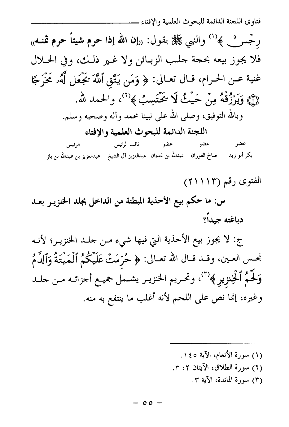 ج: لا يجوز بيع الأحذية التي فيها شيء من جلد الخنزير، لأنه نجس العين، وقد قال الله تعالى {حُرِّمَتْ عَلَيْكُمُ الْمَيْتَةُ وَالدَّمُ وَلَحْمُ الْخِنْزِيرِ} (¬1) ، وتحريم الخنزير يشمل جميع أجزائه من جلد وغيره، إنما نص على اللحم لأنه أغلب ما ينتفع به منه.