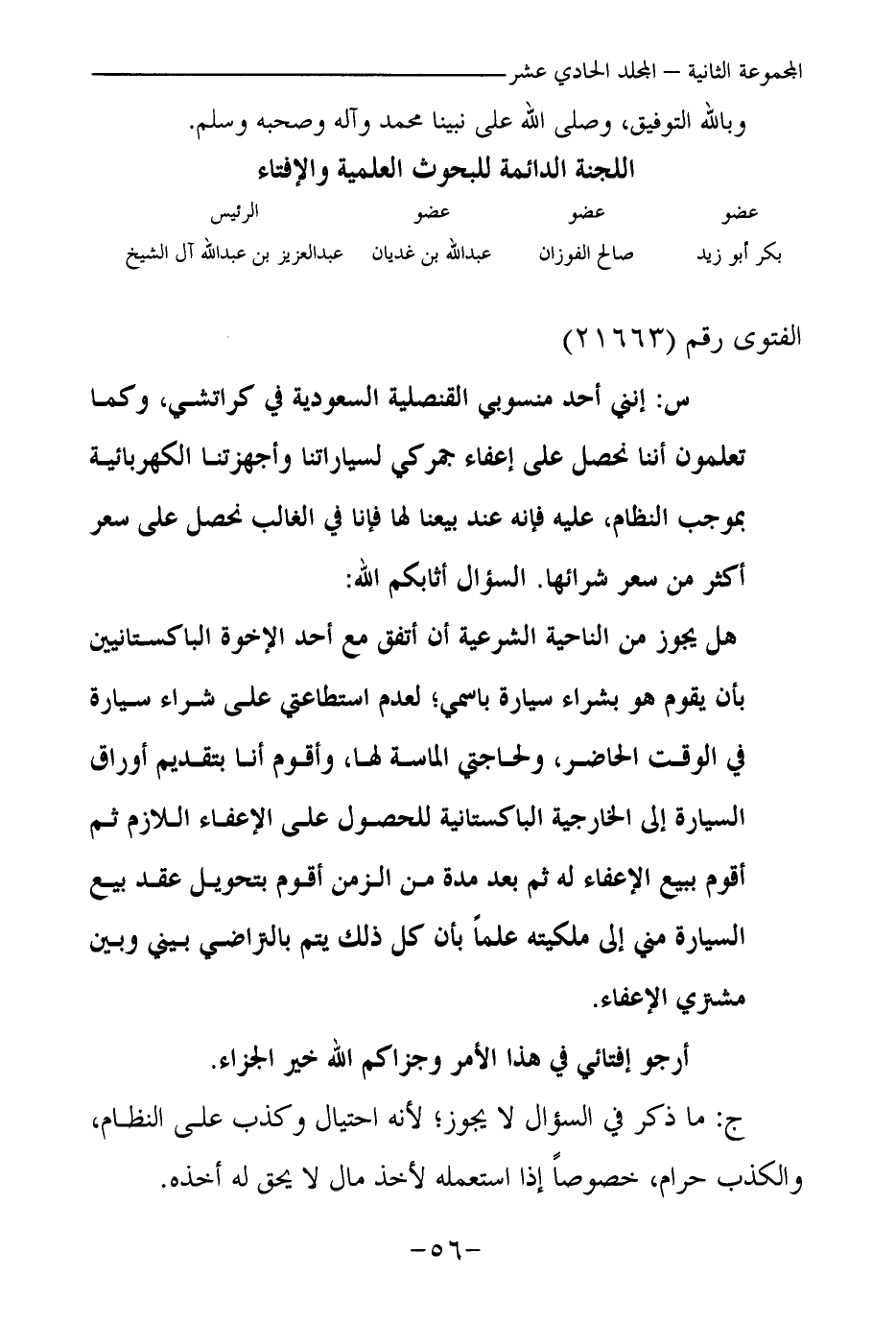 س: إنني أحد منسوبي القنصلية السعودية في كراتشي، وكما تعلمون أننا نحصل على إعفاء جمركي لسياراتنا وأجهزتنا الكهربائية بموجب النظام، عليه فإنه عند بيعنا لها فإنا في الغالب نحصل على سعر أكثر من سعر شرائها. السؤال أثابكم الله: